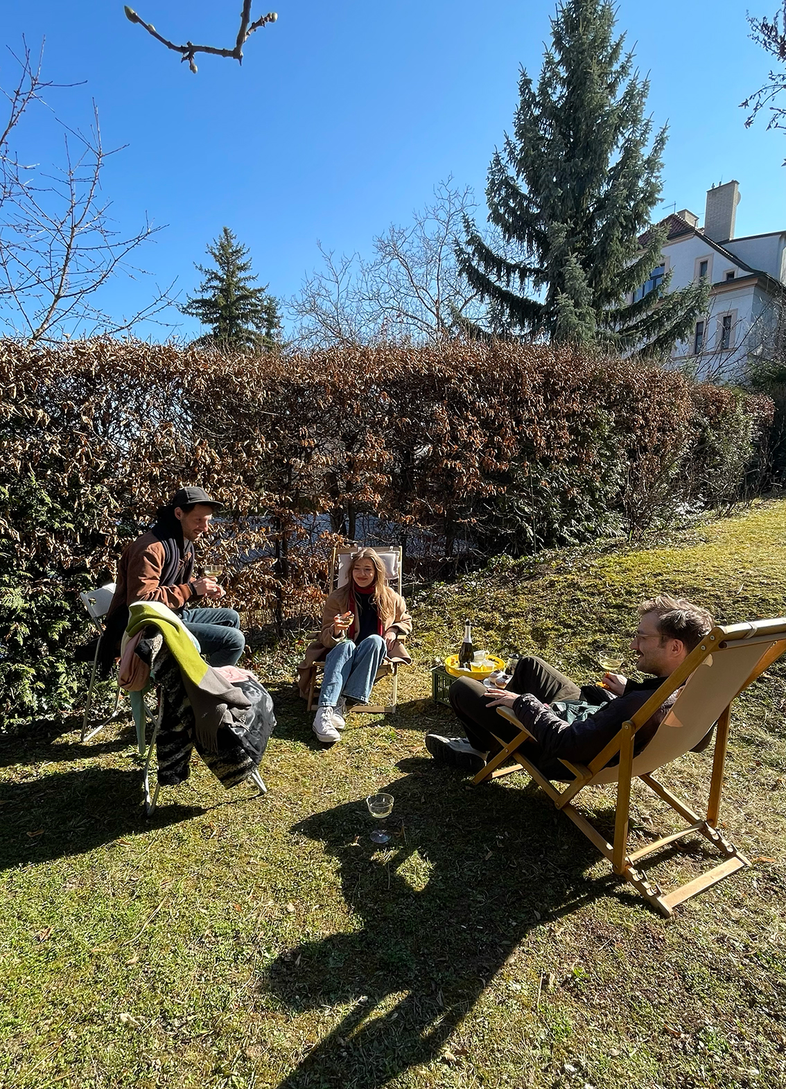 Celebrating the first day of spring in the garden. Coffee and Matyáš, cakes and David, bubbles and Emma.