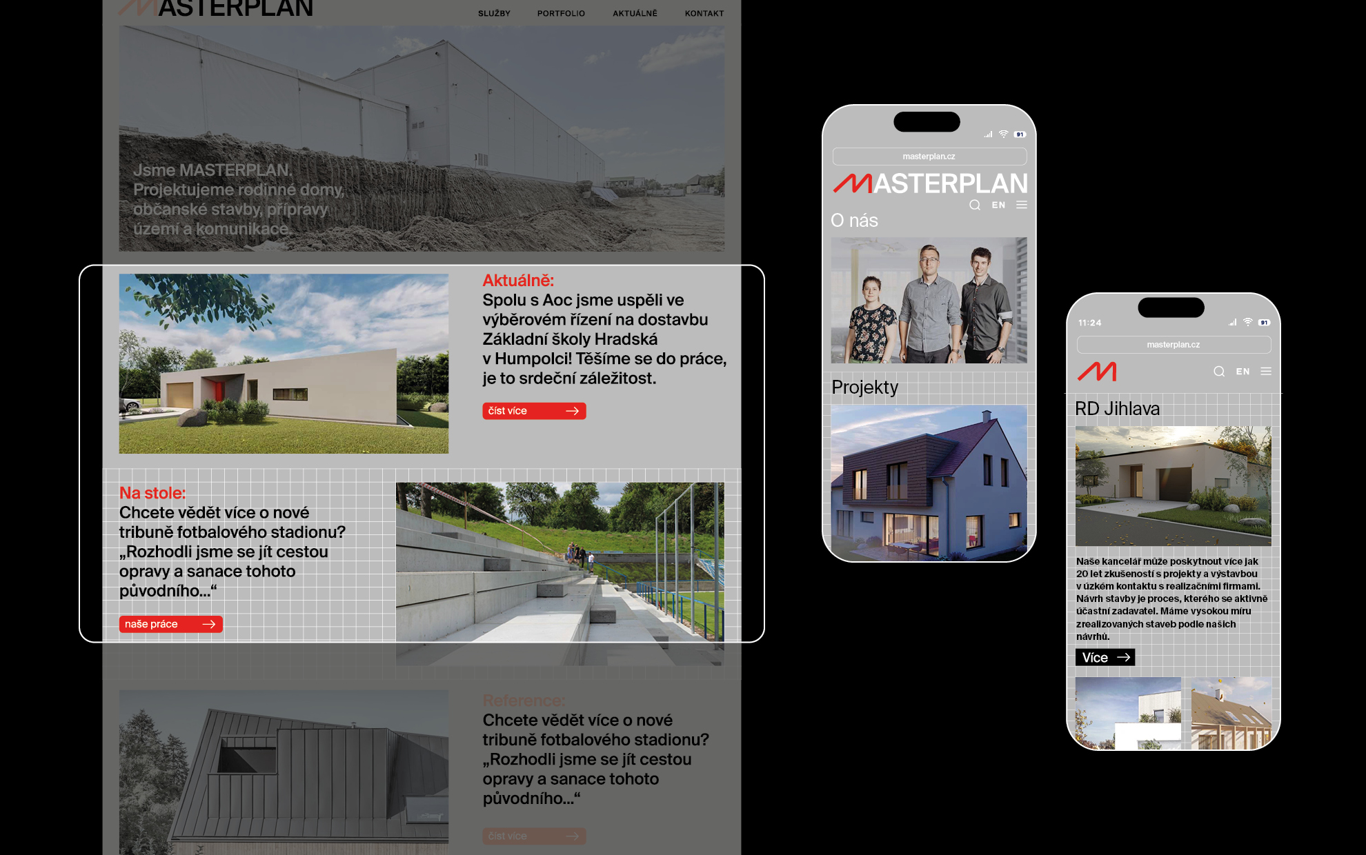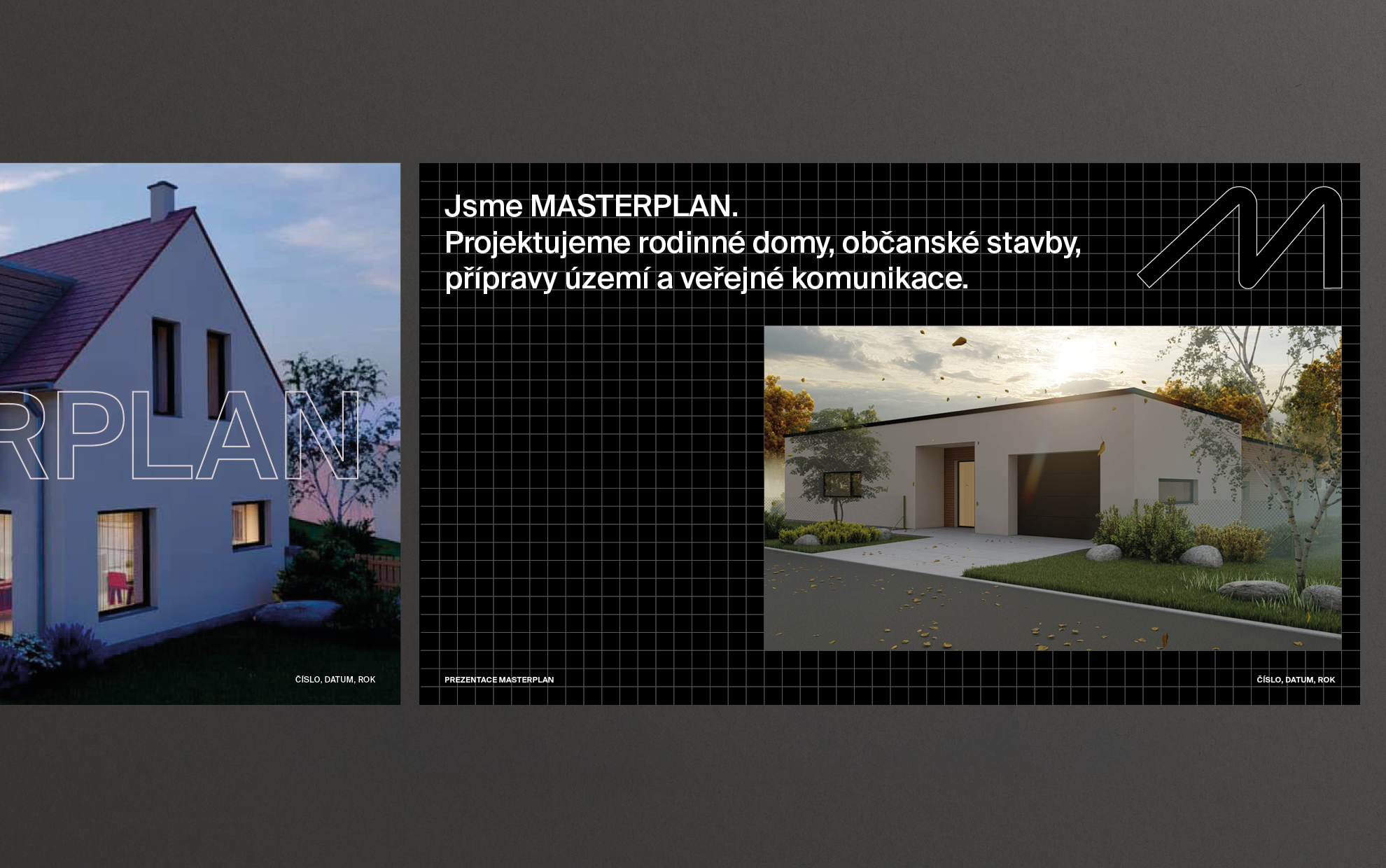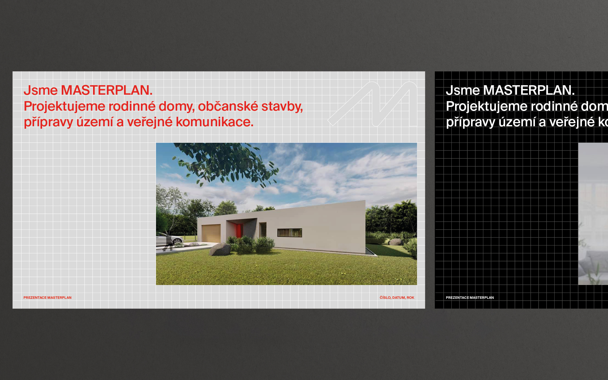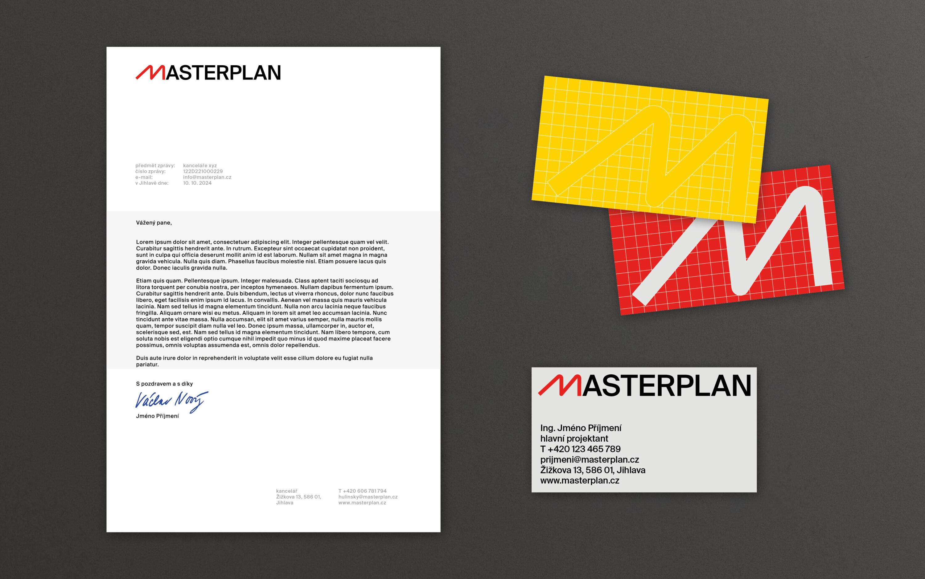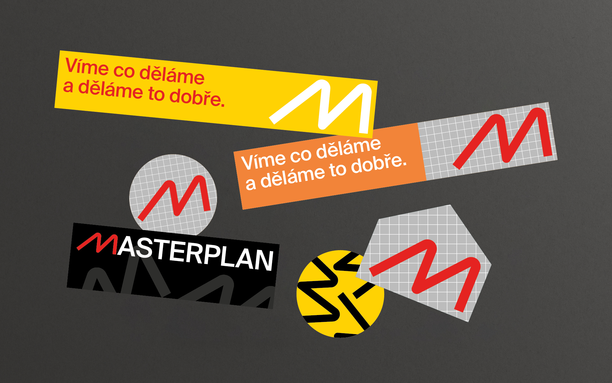 Masterplan is a company with a great name. Moreover, the pronunciation of the company’s name is typographically euphonic:). It is a design and architecture studio focused on building houses and various public projects. We bet everything on a simple letter “M”, where, in our concept, we understand the letter “M” as “Master.” The whole name is then made of universal sans-serif types, which do not have distinctive details. The primary black and red color scheme is complemented by other colors: yellow, orange, and gray. The design also plays with a different colored square grid in the identity. If the company were to display its identity in the public space, you would soon see construction fencing or red shipping containers with an upper-case M that would not be missed.