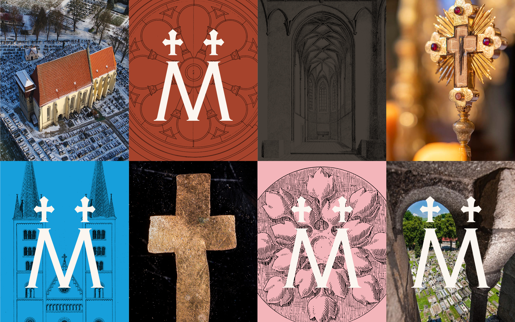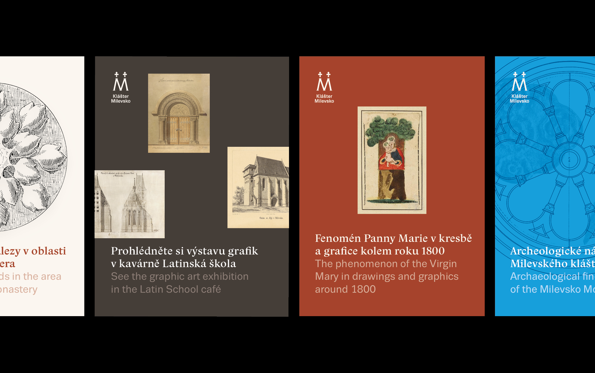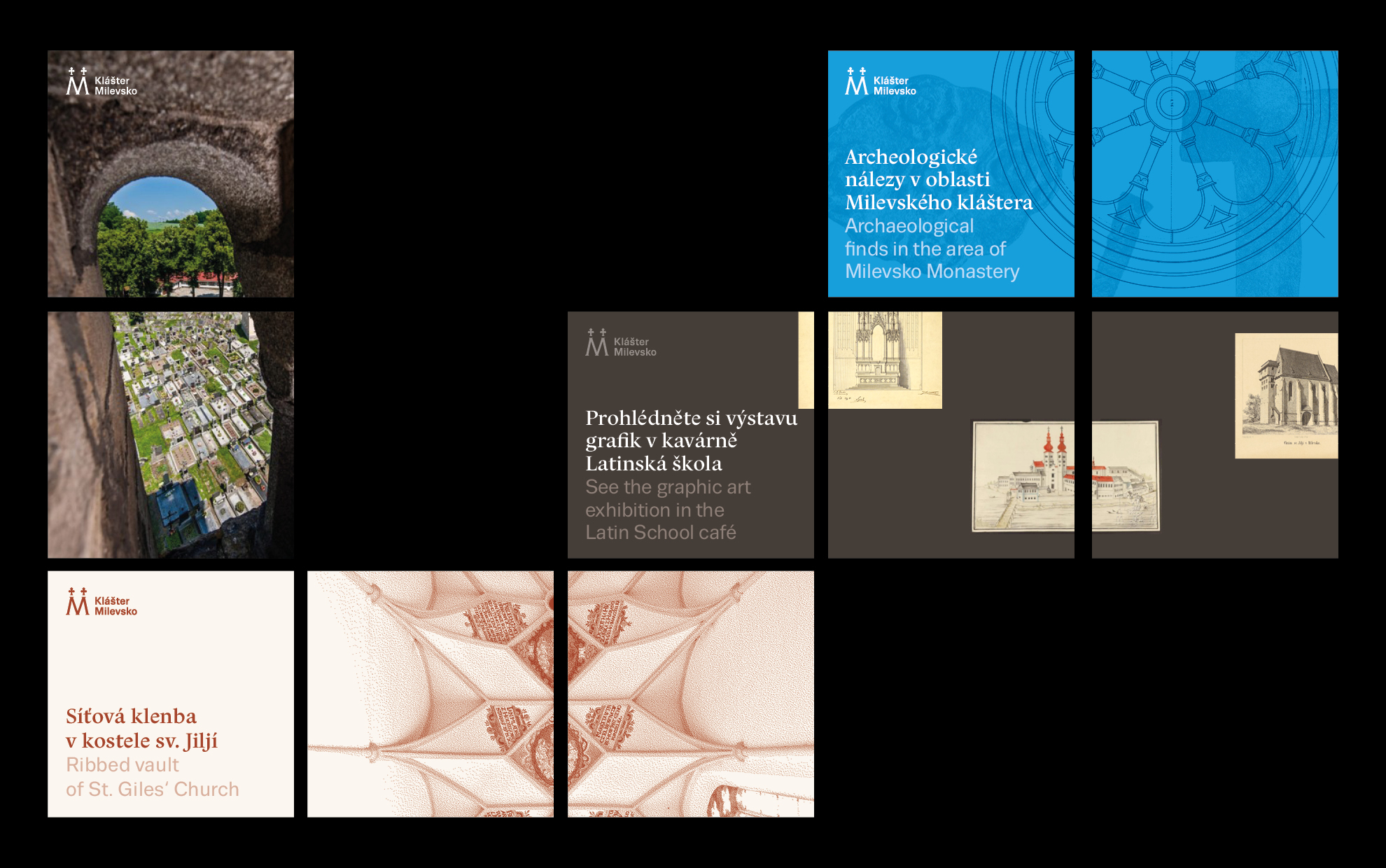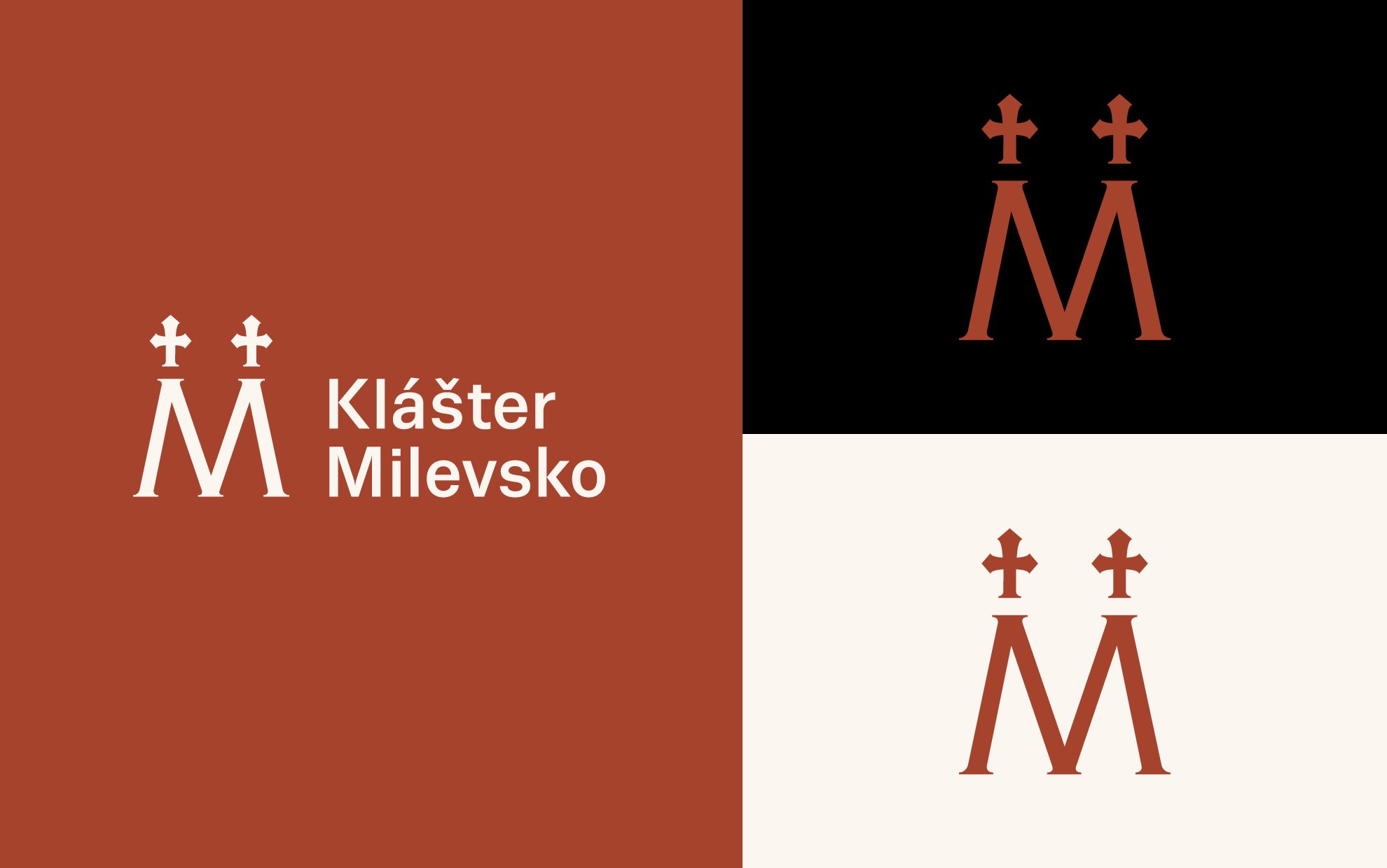The logo and visual identity of Milevsko Monastery follow the graphic style of Strahov Monastery, on which our studio cooperates. The key visual elements are the logo and the color, which, in this case, is earthy brown-red. The logo is simple; the letter M is derived from the monastery’s name. The two crosses in the logo symbolize the towers of the church of the Basilica of the Visitation of the Virgin Mary in Milevsko.