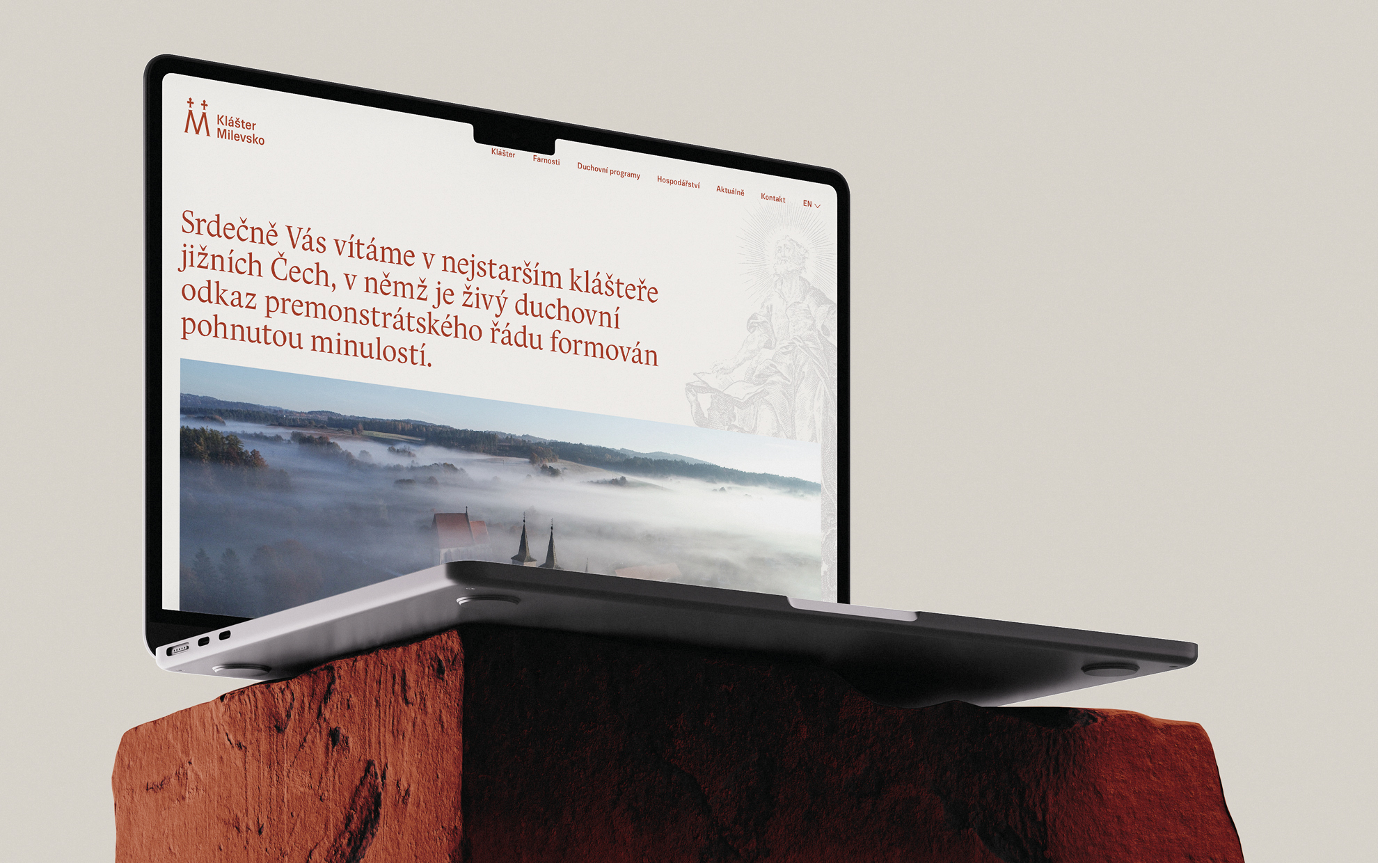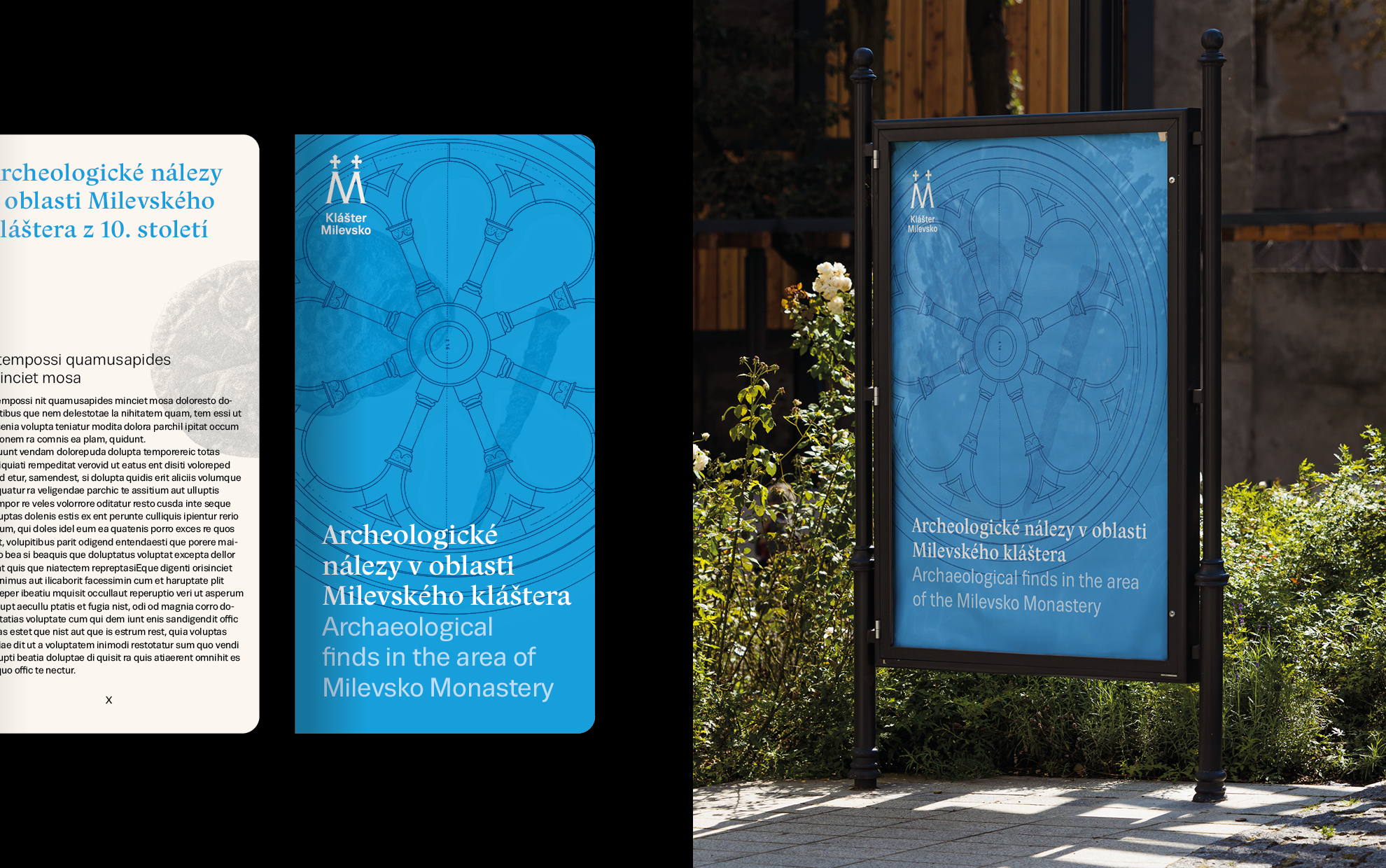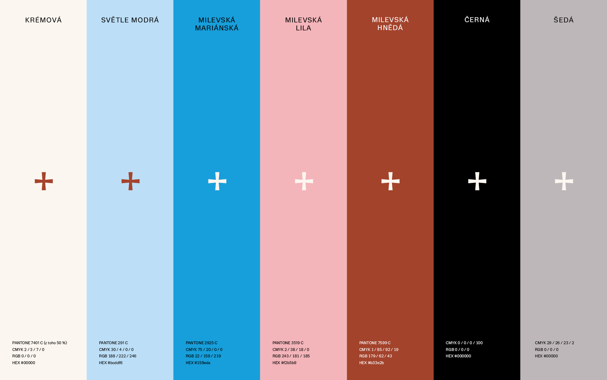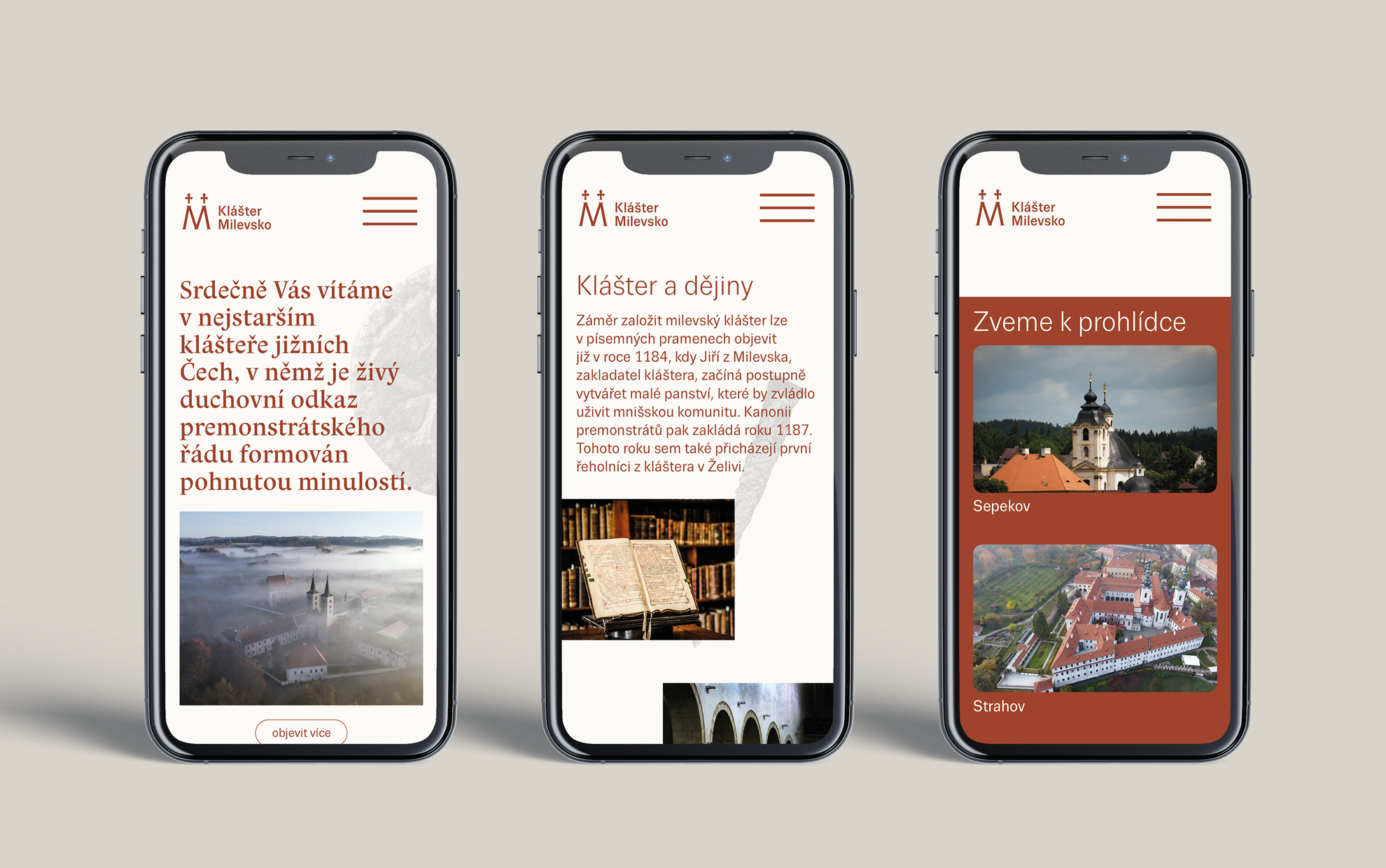 The logo and visual identity of Milevsko Monastery follow the graphic style of Strahov Monastery, on which our studio cooperates. The key visual elements are the logo and the color, which, in this case, is earthy brown-red. The logo is simple; the letter M is derived from the monastery’s name. The two crosses in the logo symbolize the towers of the church of the Basilica of the Visitation of the Virgin Mary in Milevsko.