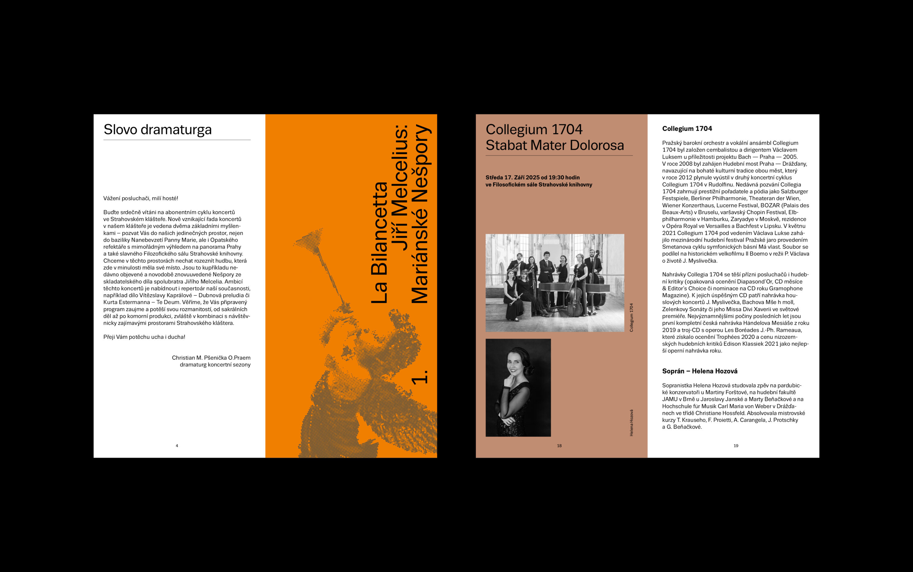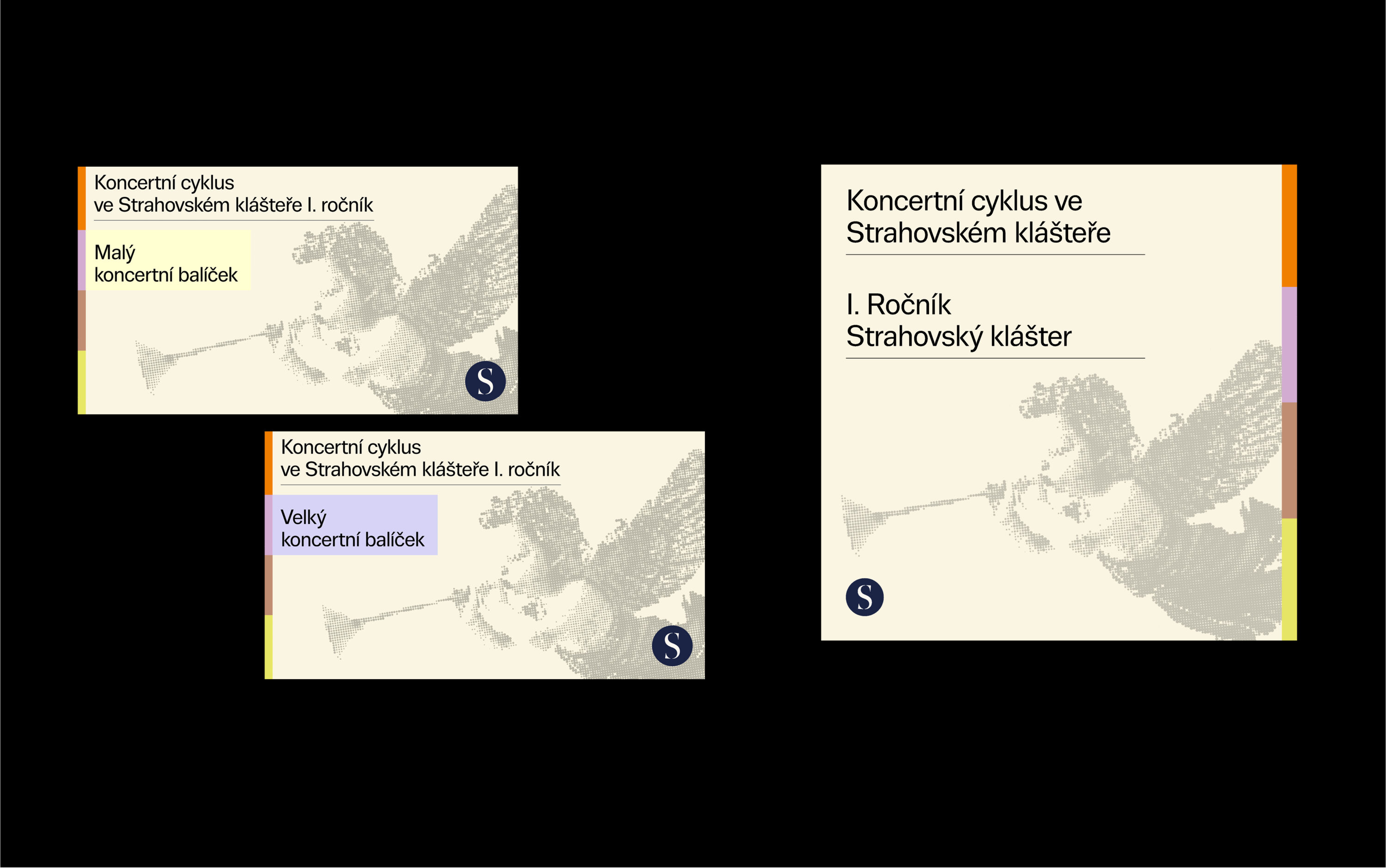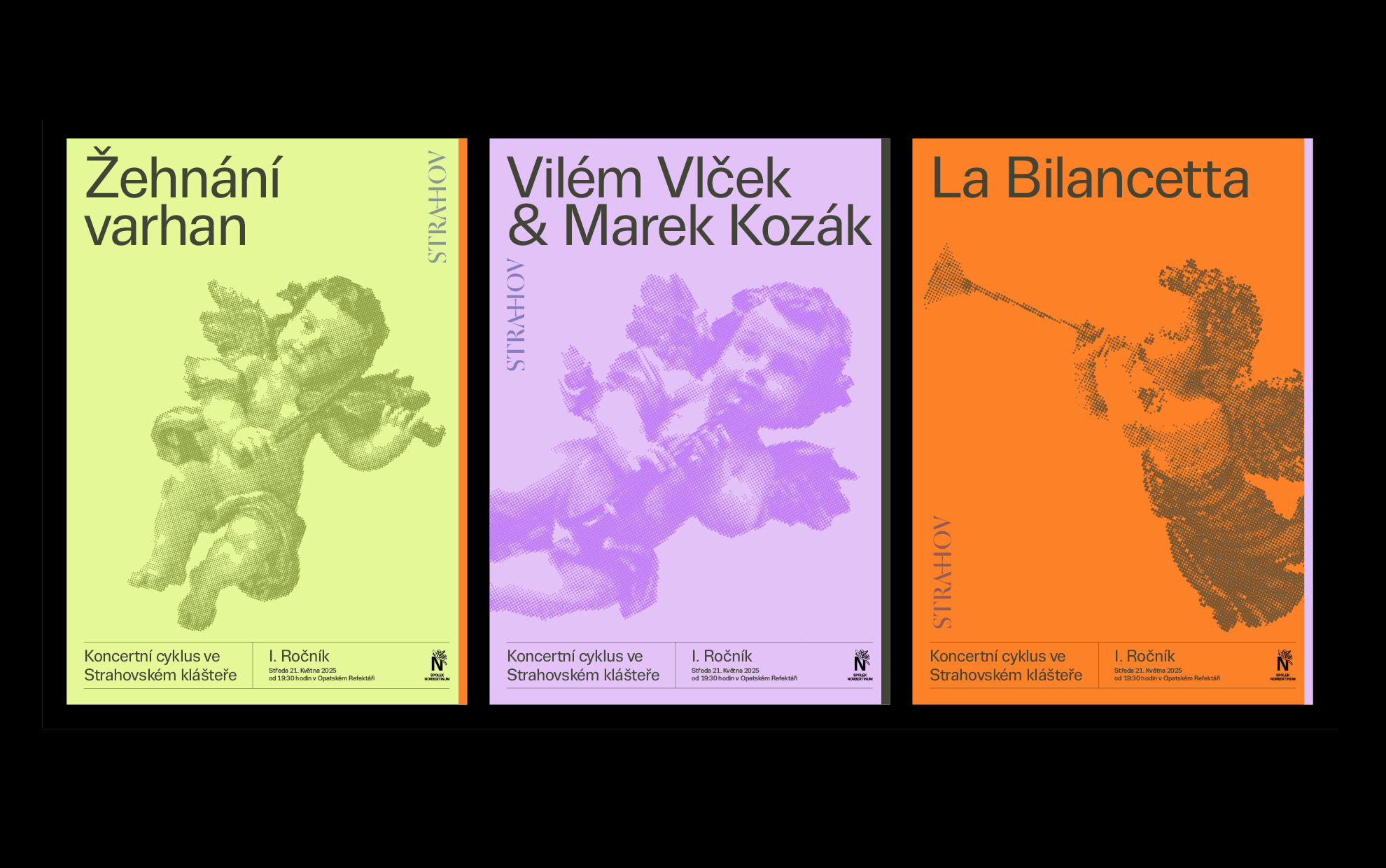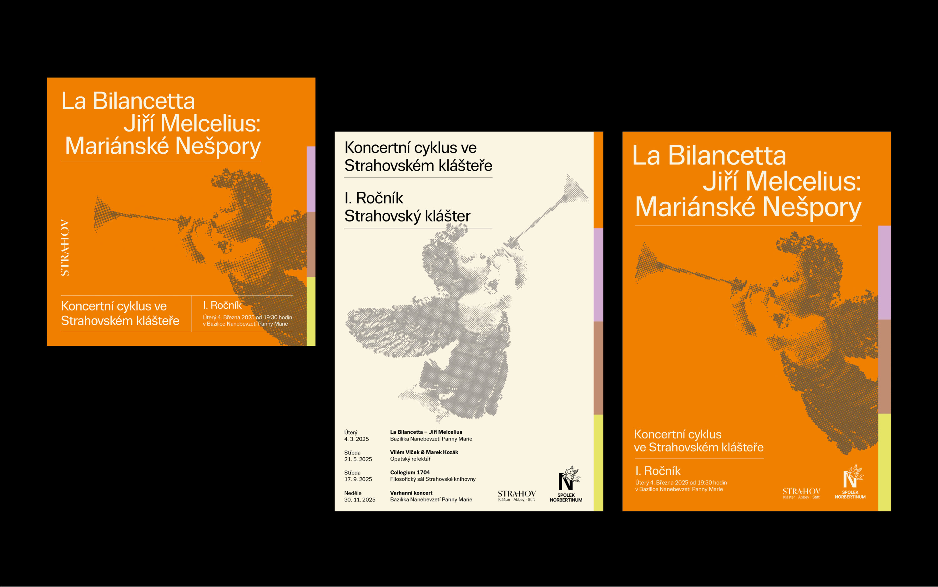 The Norbertinum Society continues to spread culture, education, and art at the Strahov Monastery. It is a treasure linked to this unique place. The challenge for the Society’s current dramaturgy is to build on the past with its subscription cycles, which had a permanent place on the beautiful premises of the monastery in the past. The first year of this musical event was delicately conceived; we used no more than a color chord to distinguish the individual concerts of the season. The design of the logo and the accompanying printed material, including the posters, reflects the visual identity of the monastery.