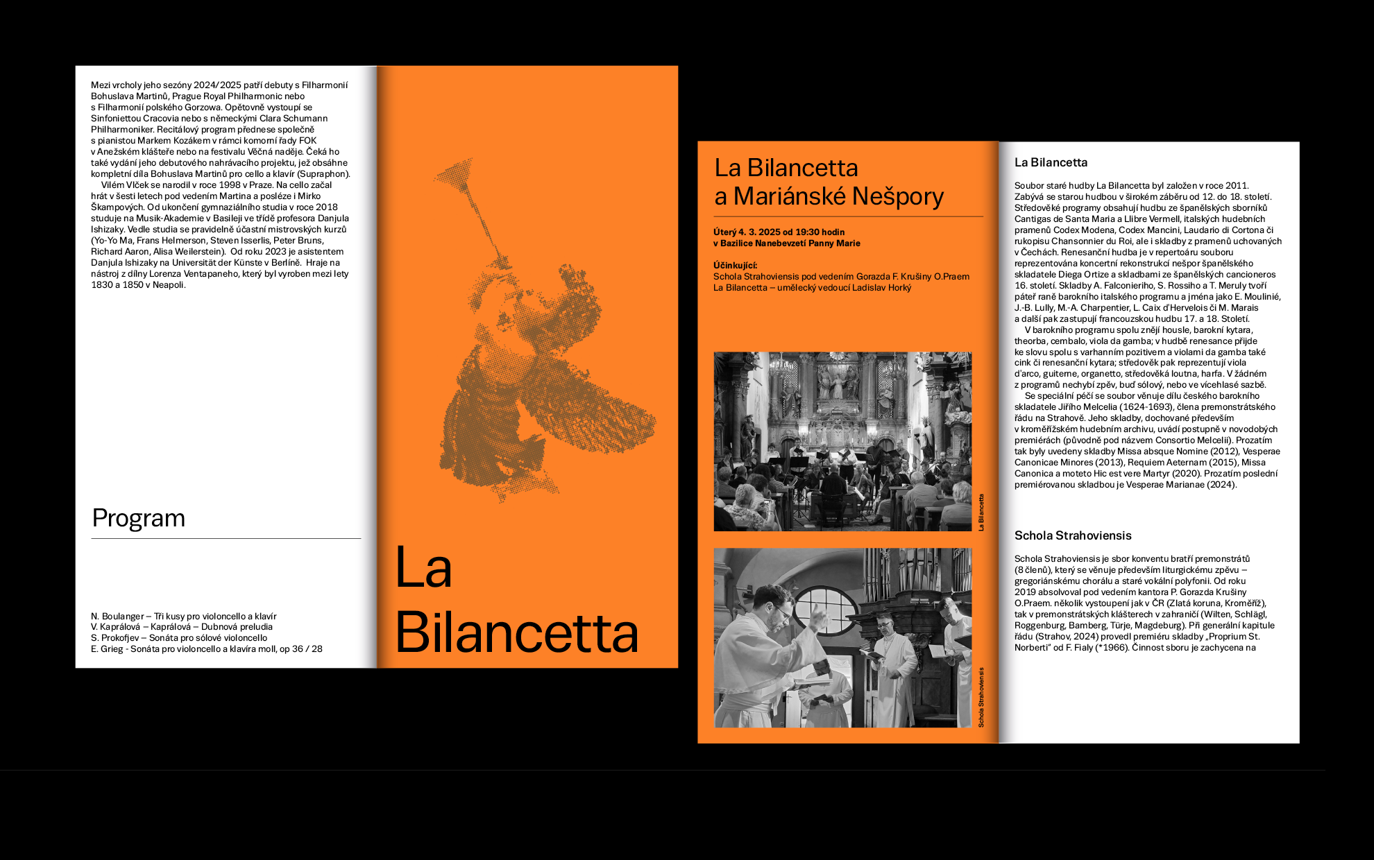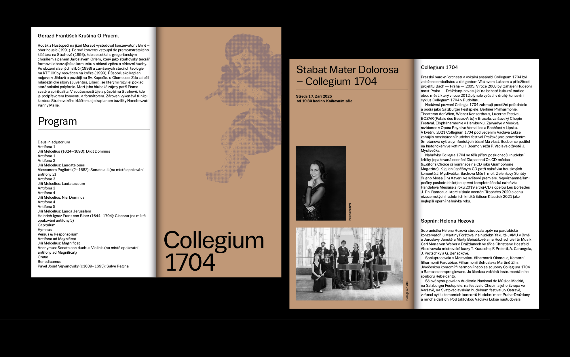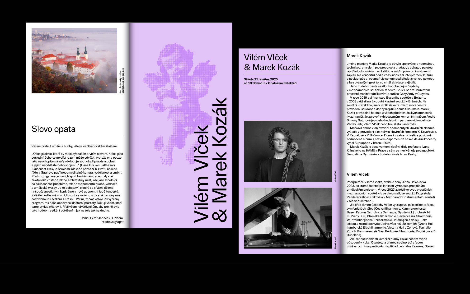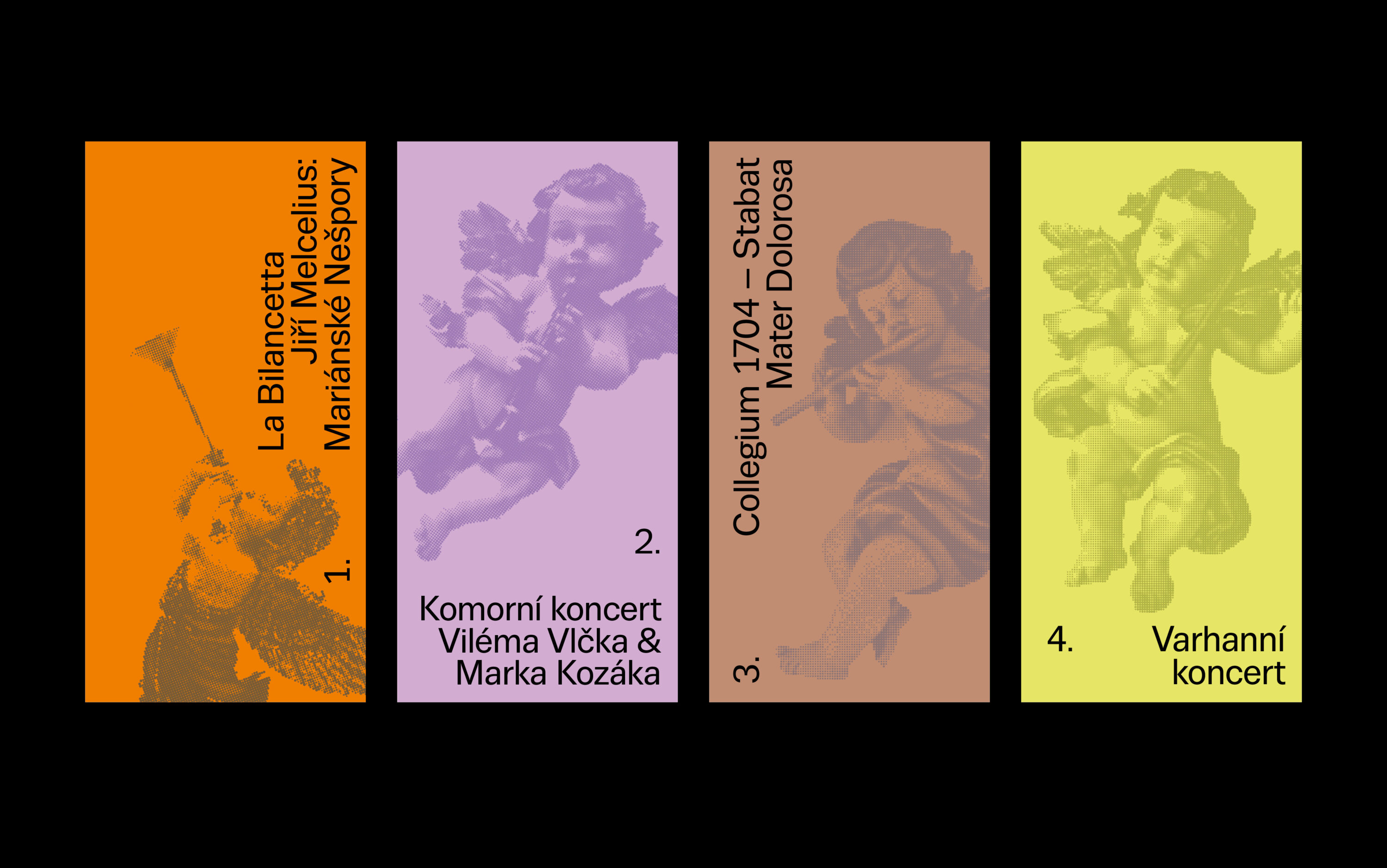 The Norbertinum Society continues to spread culture, education, and art at the Strahov Monastery. It is a treasure linked to this unique place. The challenge for the Society’s current dramaturgy is to build on the past with its subscription cycles, which had a permanent place on the beautiful premises of the monastery in the past. The first year of this musical event was delicately conceived; we used no more than a color chord to distinguish the individual concerts of the season. The design of the logo and the accompanying printed material, including the posters, reflects the visual identity of the monastery.