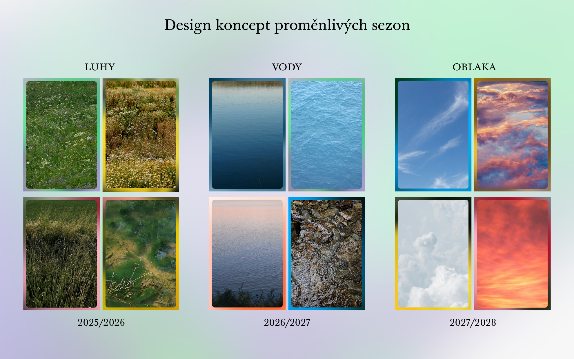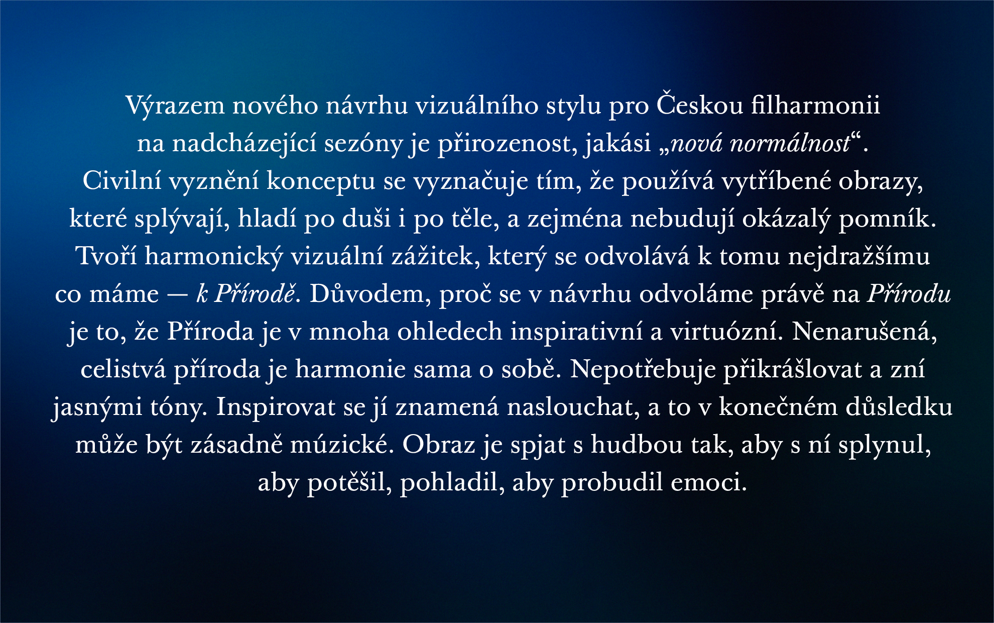 In addition, the new visuality of the Czech Philharmonic would be bolstered by color compositions in the “blur” mode, which are based on the original photographs but eventually look different, like a visual transformation. They could be used when we augment motifs from nature with these non-specific color “intermezzos”; thus, the design becomes more layered and diverse. This approach builds on the current layered visuality of Instagram and other social media platforms. These layers (the “blur” layer and the photographs) would be implemented over five years.