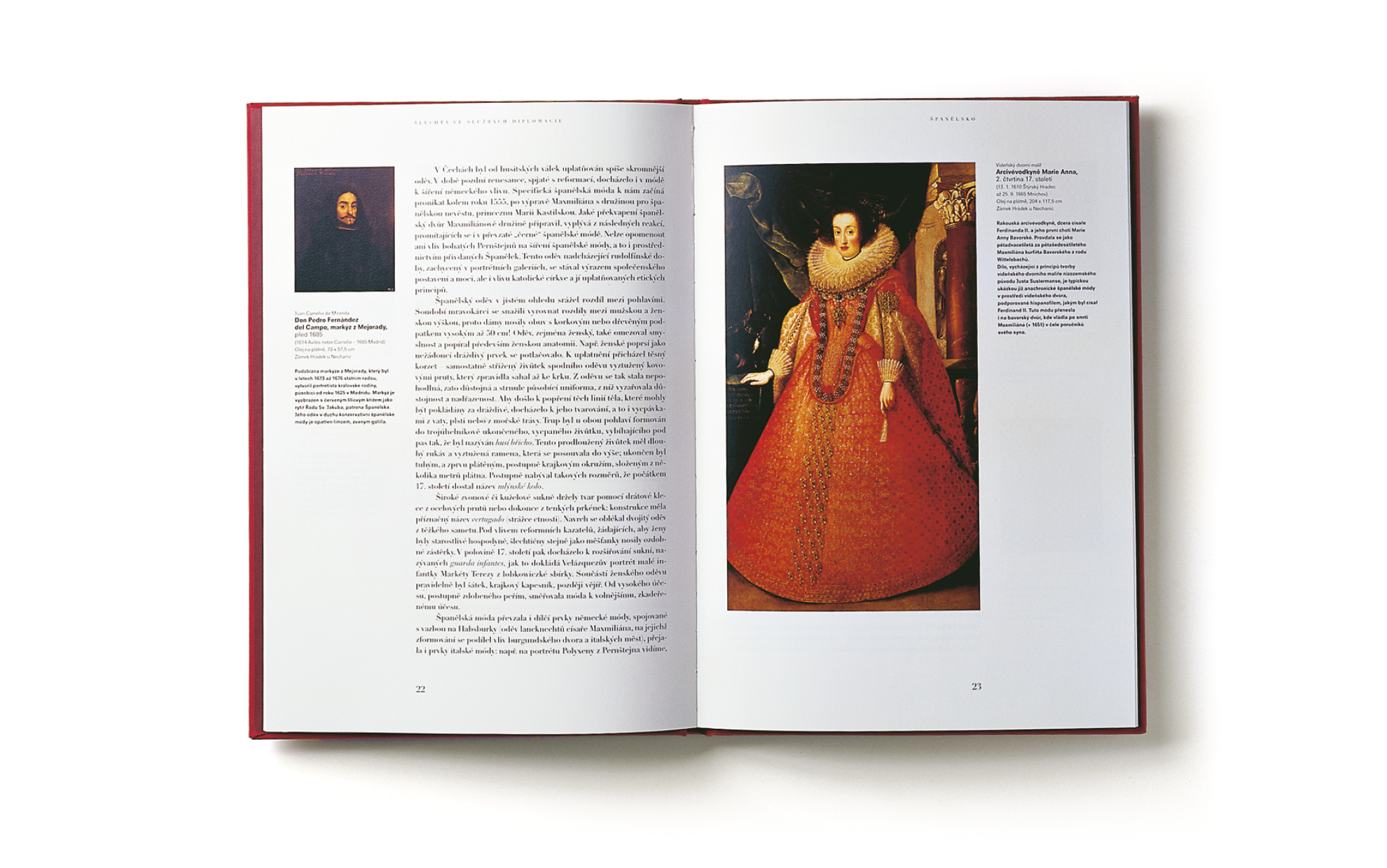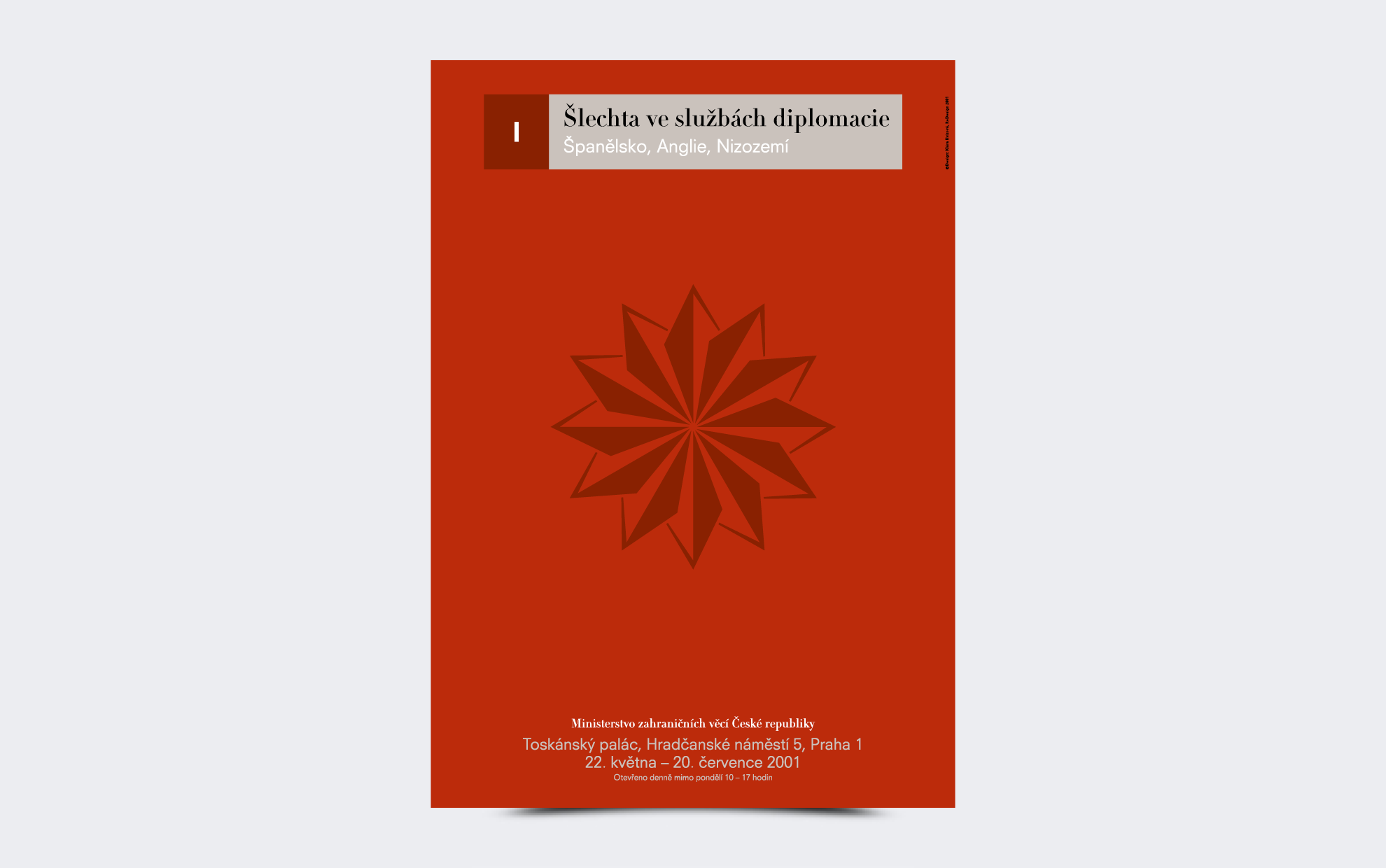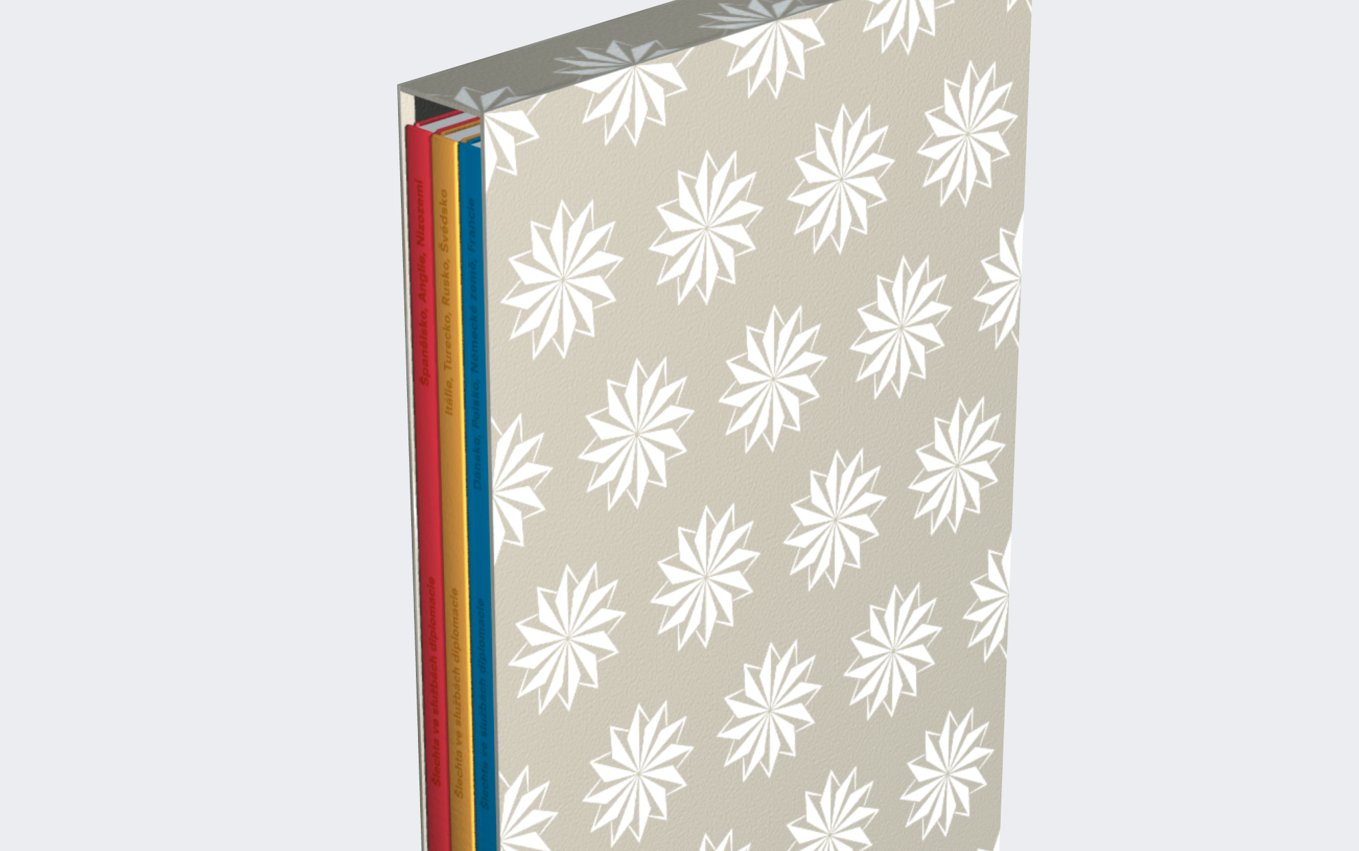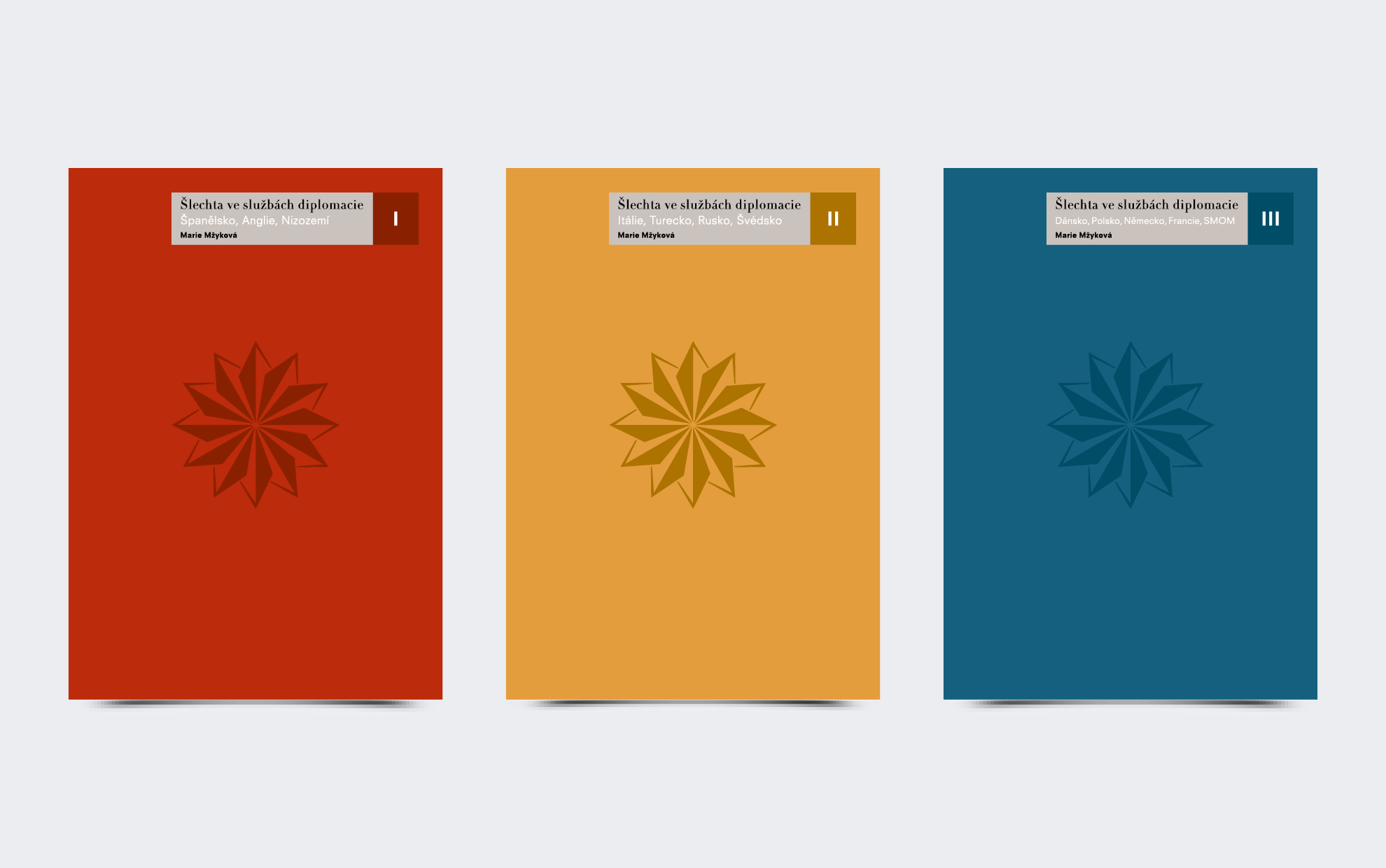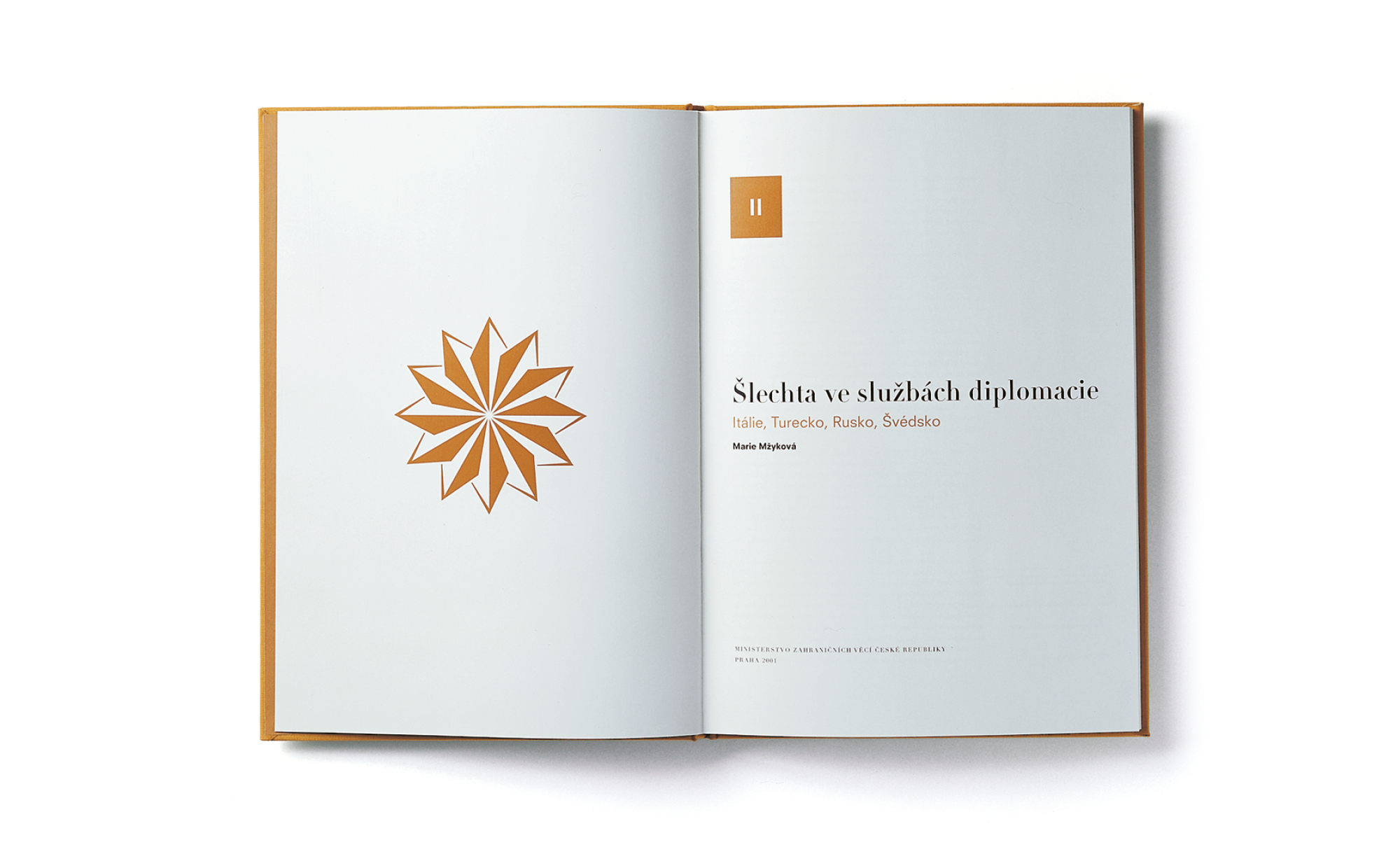 The nobility in the service of diplomacy is a collection of three subtle books, which were initiated by the curatorial initiative of Dr. Mžyk, who also initiated the exhibition of the same name at the Ministry of Foreign Afairs in the Tuscan Palace in Prague. The books were published a long time ago. They were not for sale, but given as a gift. When designing them, I was inspired by books about Art, which were graphically edited by František Muzika, called “razors”. They are books of a larger format with a small number of pages, but in a hard, linen binding. The books have a canvas and a label pasted into the matrices of a pre-embossed place with the title of the book. Pure conservatism, that will not get boring.