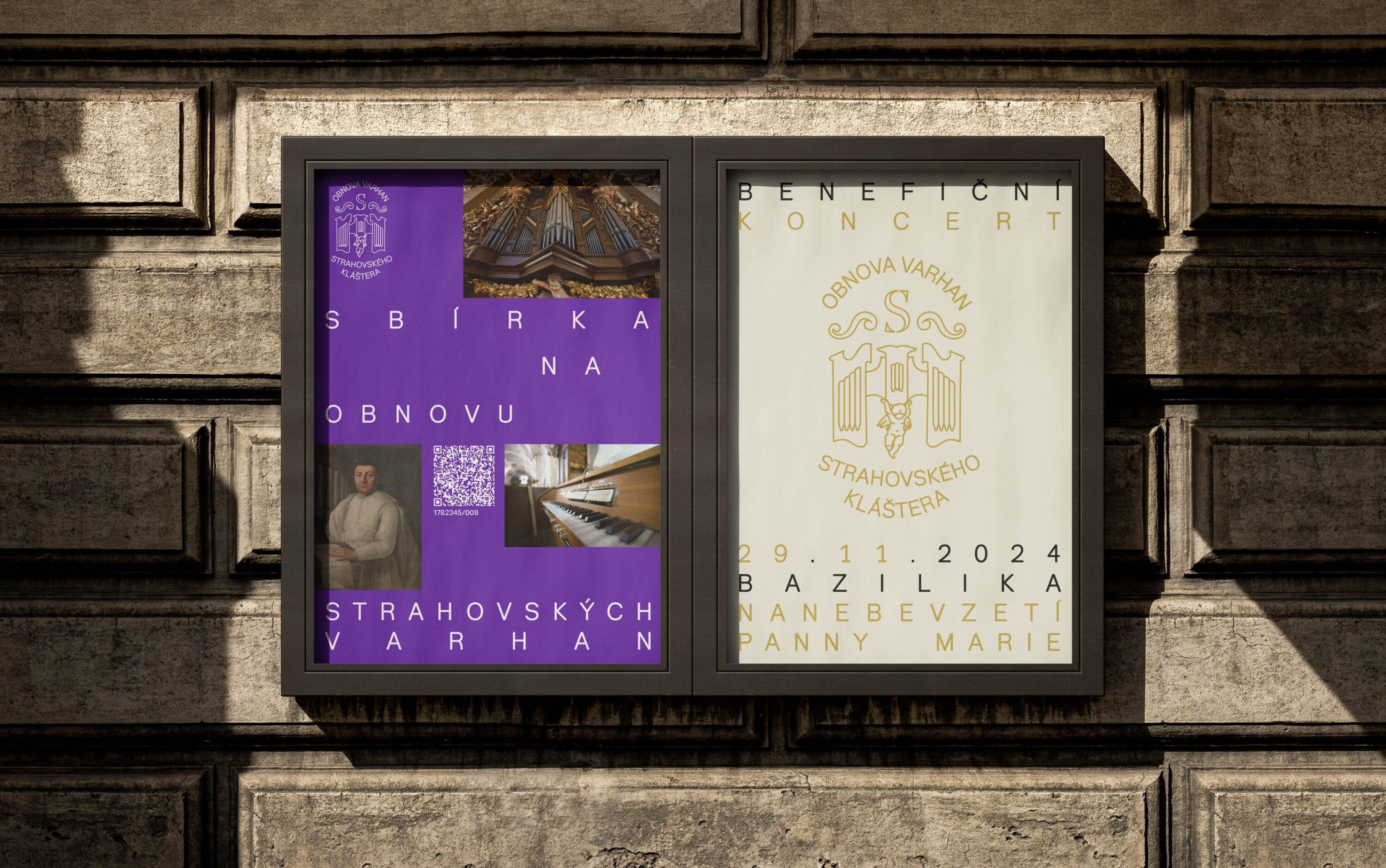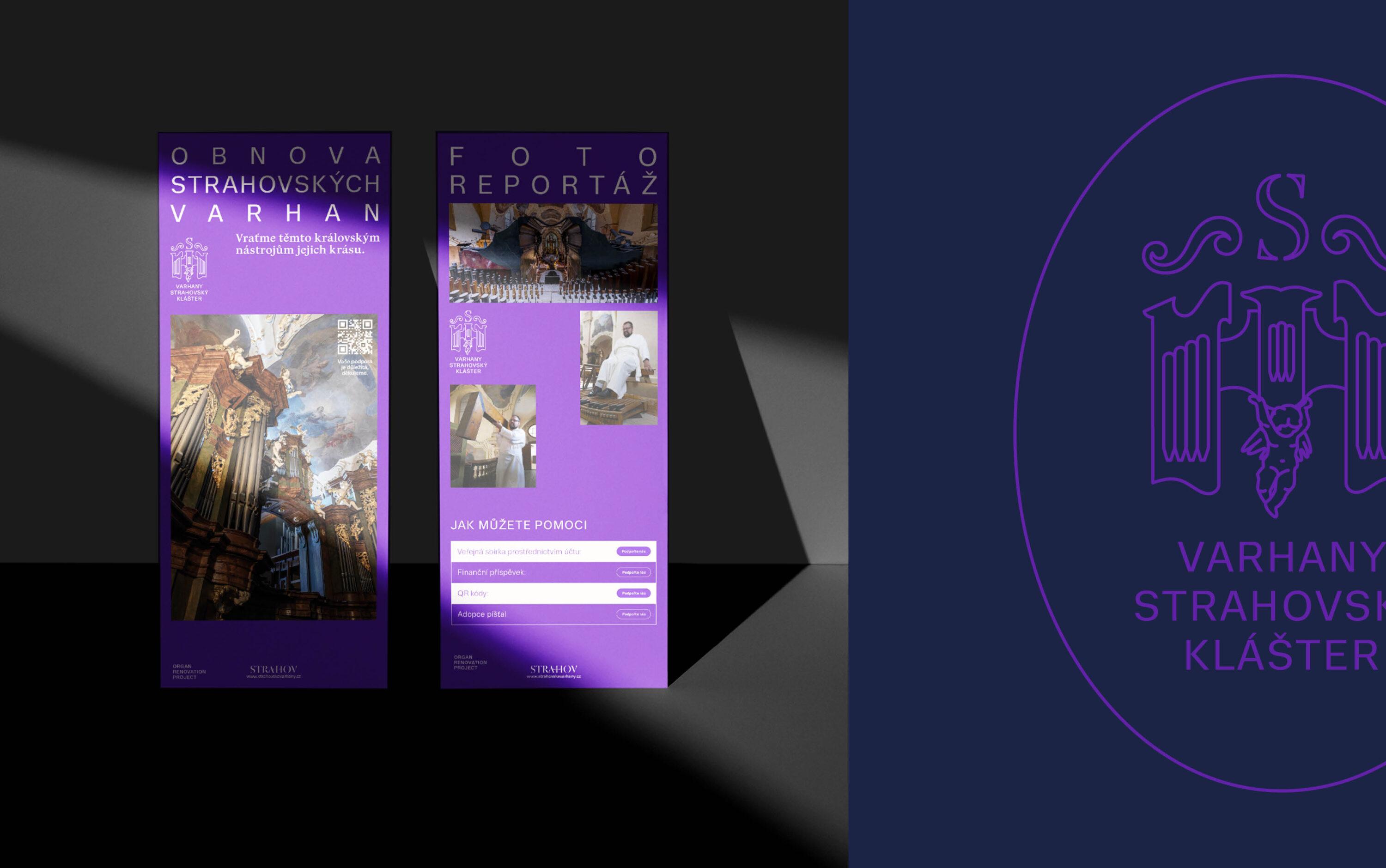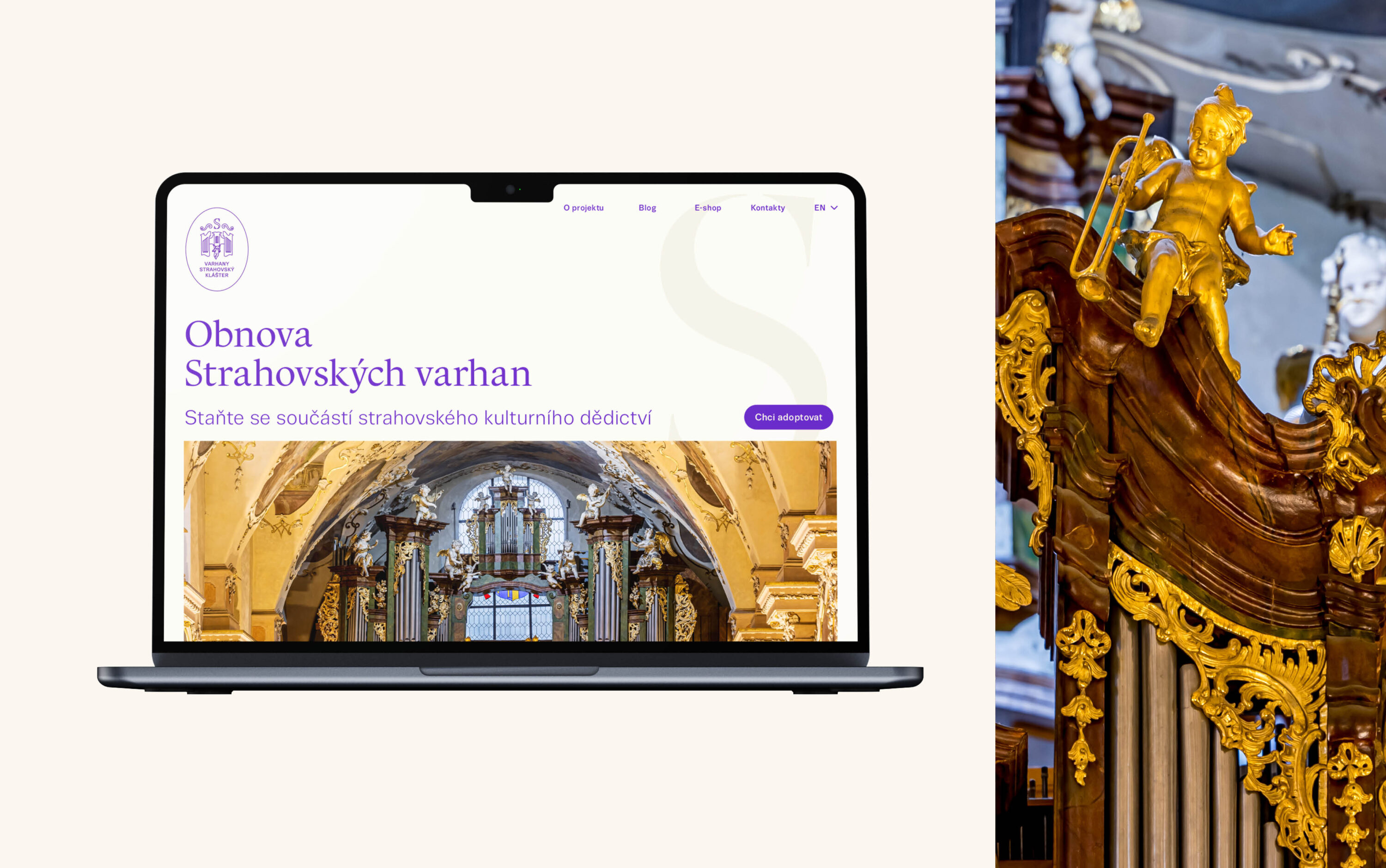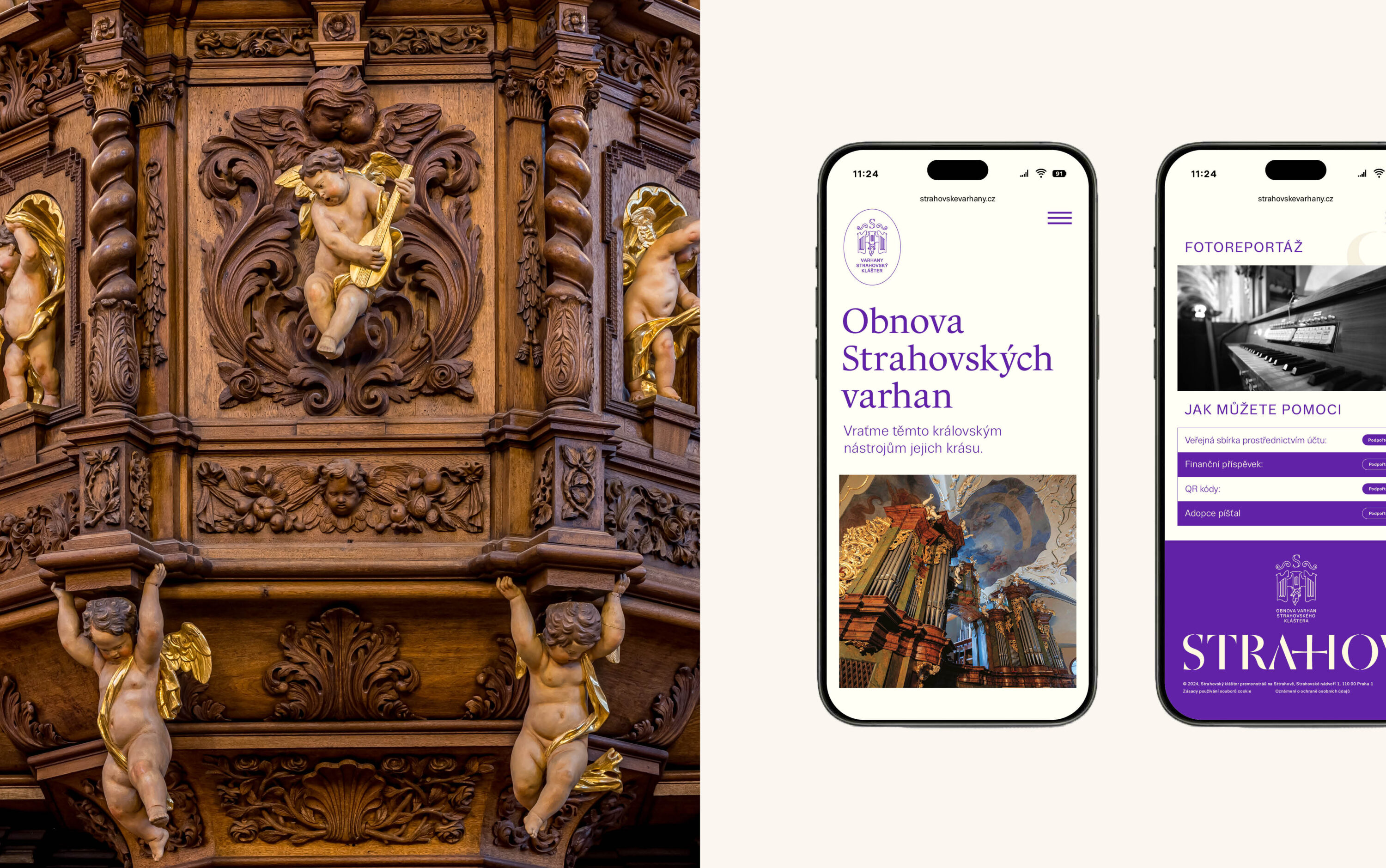 The project to restore the organs of the Strahov Monastery is a project that aims to make the history and presence of these outstanding instruments better known to the public. Both organs are in the Basilica of the Assumption of the Virgin Mary at Strahov, and donations are solicited for their restoration. Our work on the project includes designing a logo, website design, and printed materials to support the collection. The basis of the design starts with the instruments themselves, which in both cases are decorated with late Baroque carvings, where we can find many carved cherubs, which was the inspiration for the logo. The logo becomes a romantic emblem where the abstracted symbol of an organ, the typeface, and the simplified cherub motif meet. We added a distinctive purple color to the hues of the Strahov Monastery’s identity. The result is a contemporary, colorful pictorial–an almost literal–drawing of the brand without intense stylization. And we loved it!