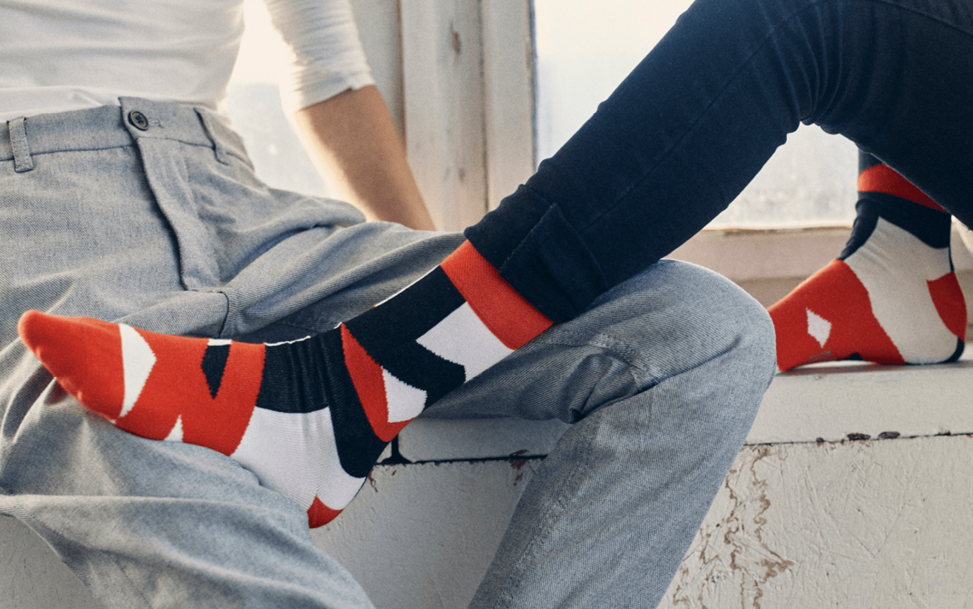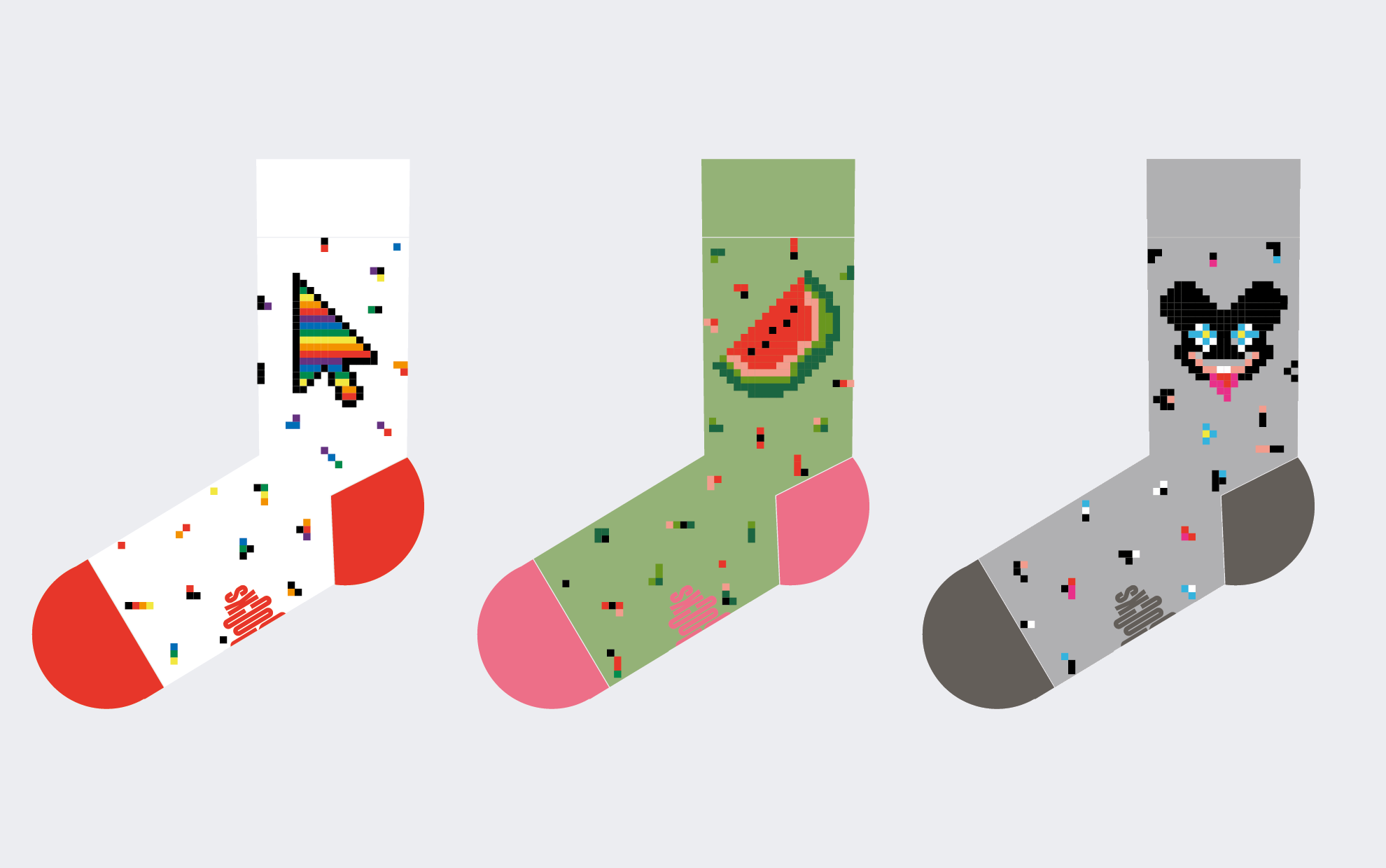 Designovat ponožky? Zábava! Norbert Gáfrik nás oslovil, abychom spolu s dalšími designéry navrhli ponožkovu kolekci. Zúčastnili se také Lucie Kutálková (Leeda), Martina Novotná a Dan Bek. My jsme částečně recyklovali návrh knižní řady pro Academii – zjistilo se, že na ponožky se hodí stejně dobře jako na knihy. Vznikly tři varianty, Digital Mickey, Digital Melon a Digital Cursor. Barvy a způsob provedení je záměrně unisex, aneb všichni nosí všechno. Kolekci nafotil Jiří Hroník.