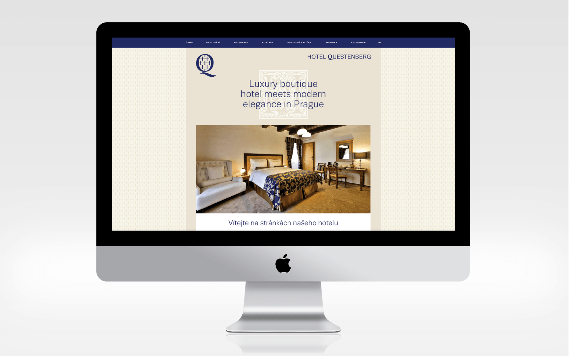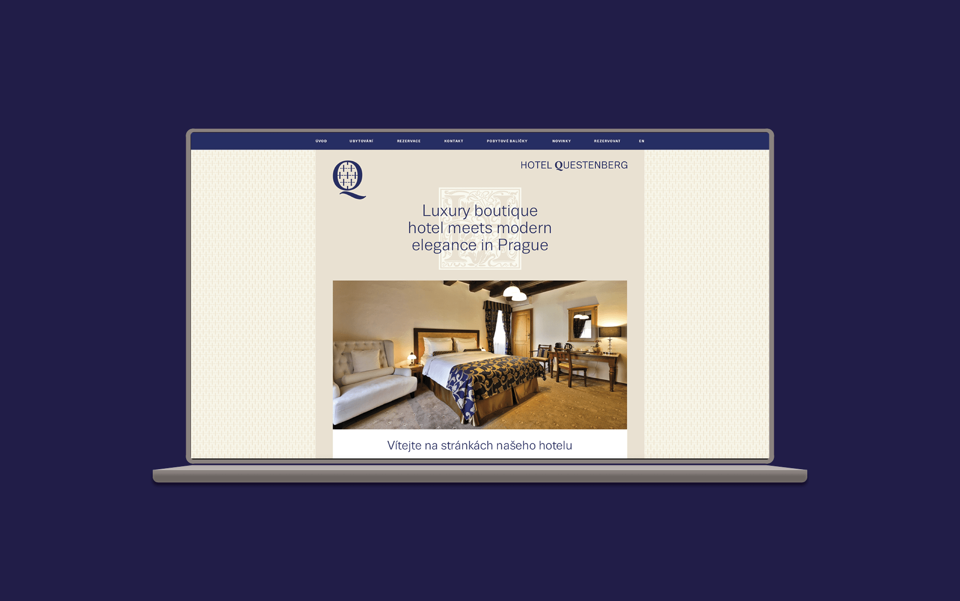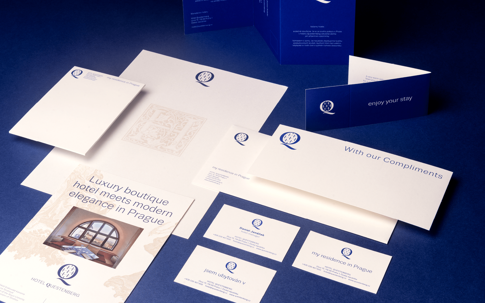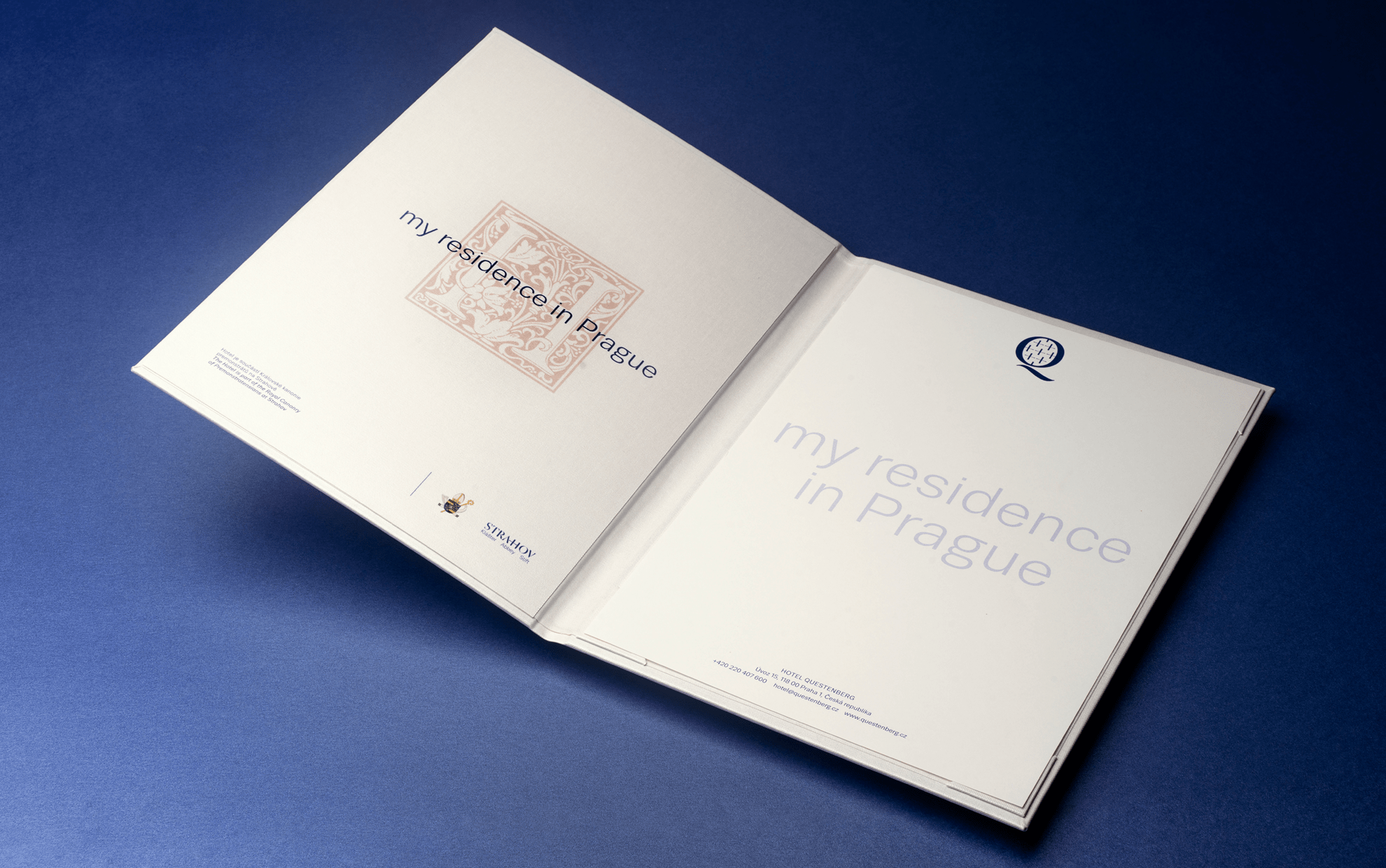 Hotel Questenberg najdete na Pohořelci a je součástí Strahovské kanonie. Značka hotelu Questenberg navazuje na typografii Strahovského kláštera a je stejně jako logo kláštera součástí jednotné grafické identity. Jako symbol jsme zvolili literu Q, která je doplněna o rastr křížků. Všechny tiskoviny jsou řešeny jednoduše v jedné modré barvě. Jako základní písmo používáme bezserifový font Trivia Strahov.