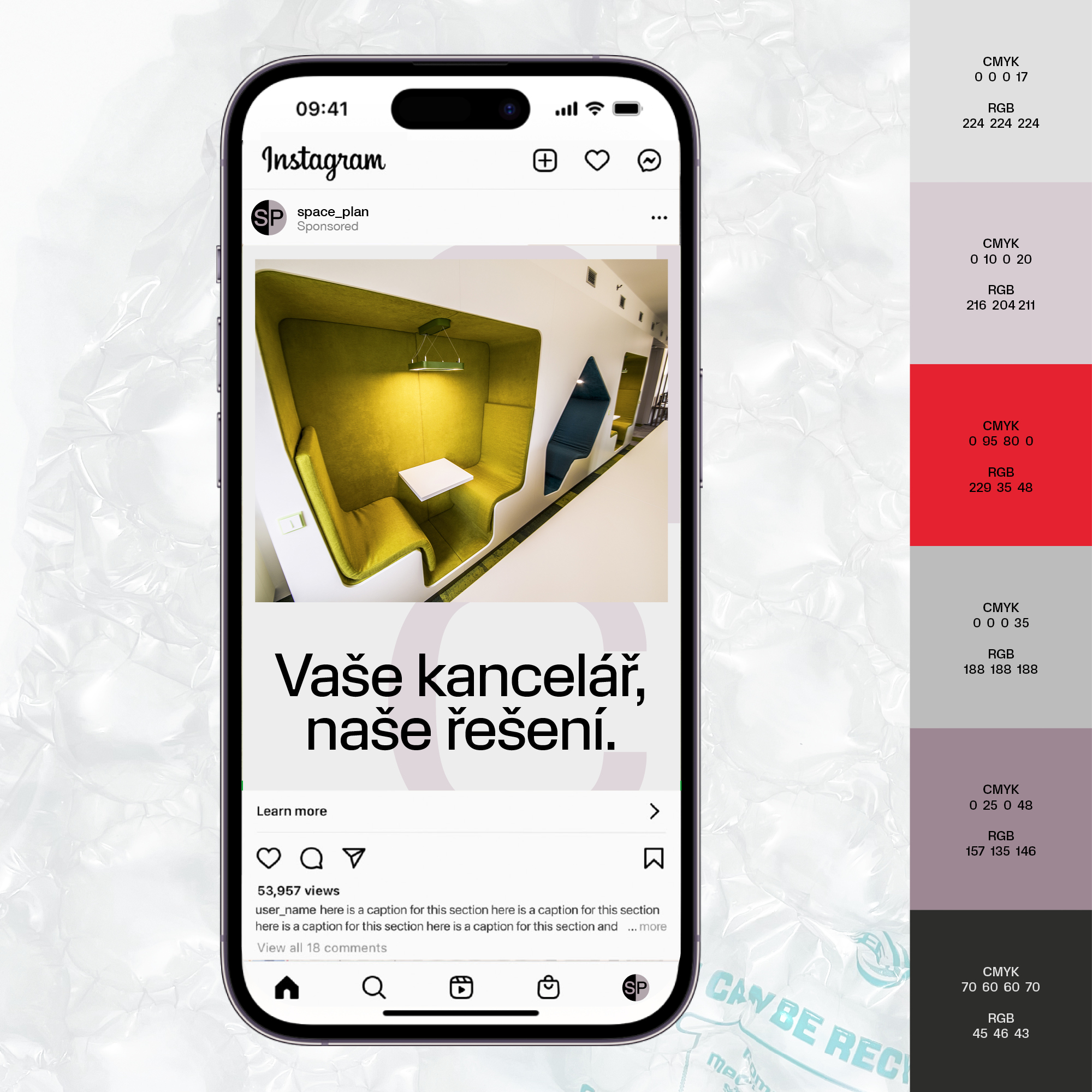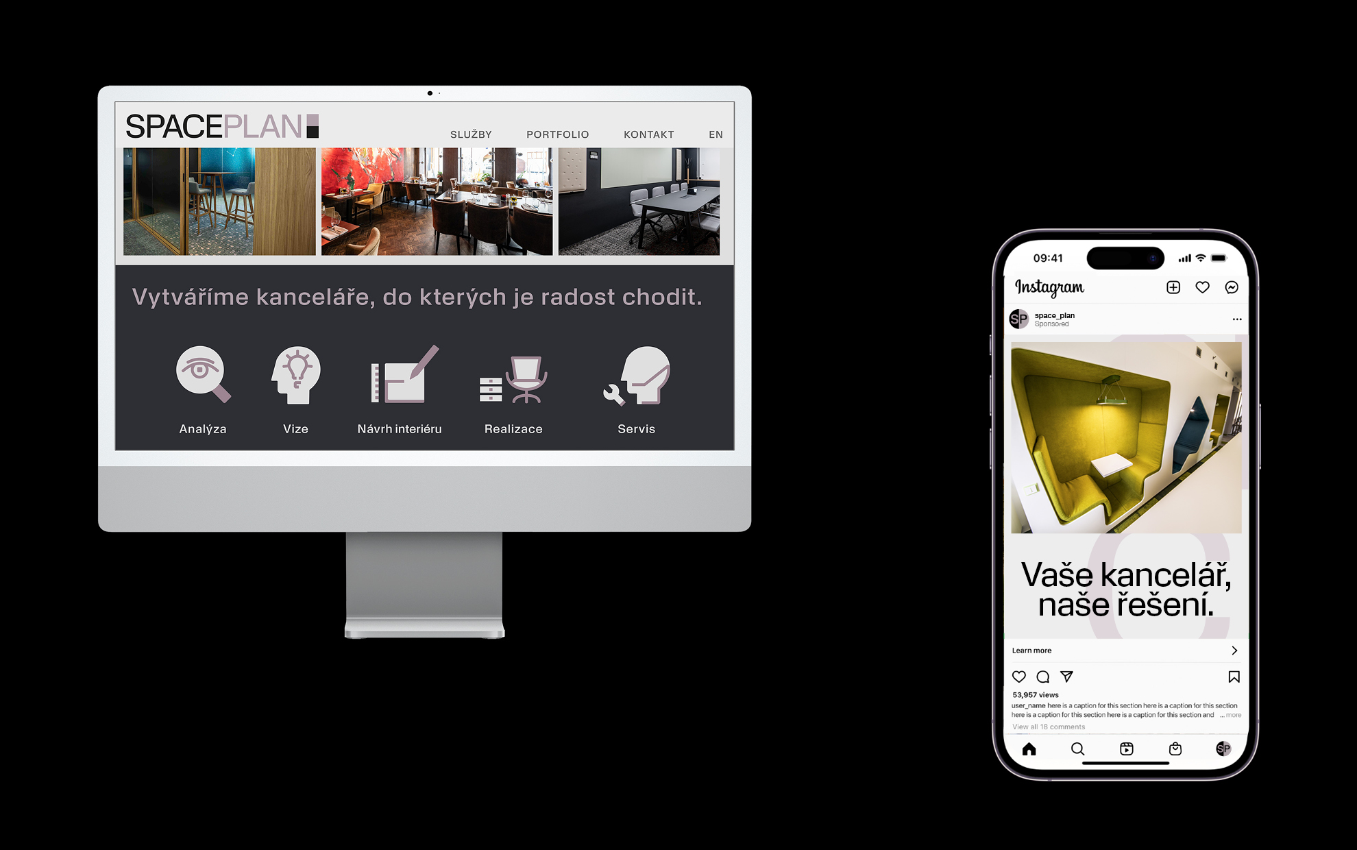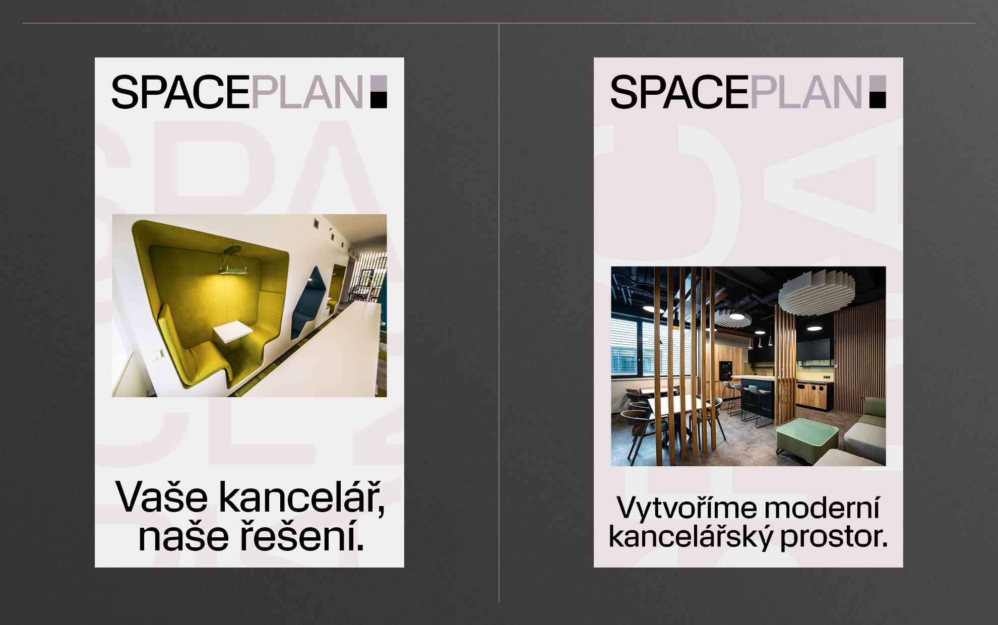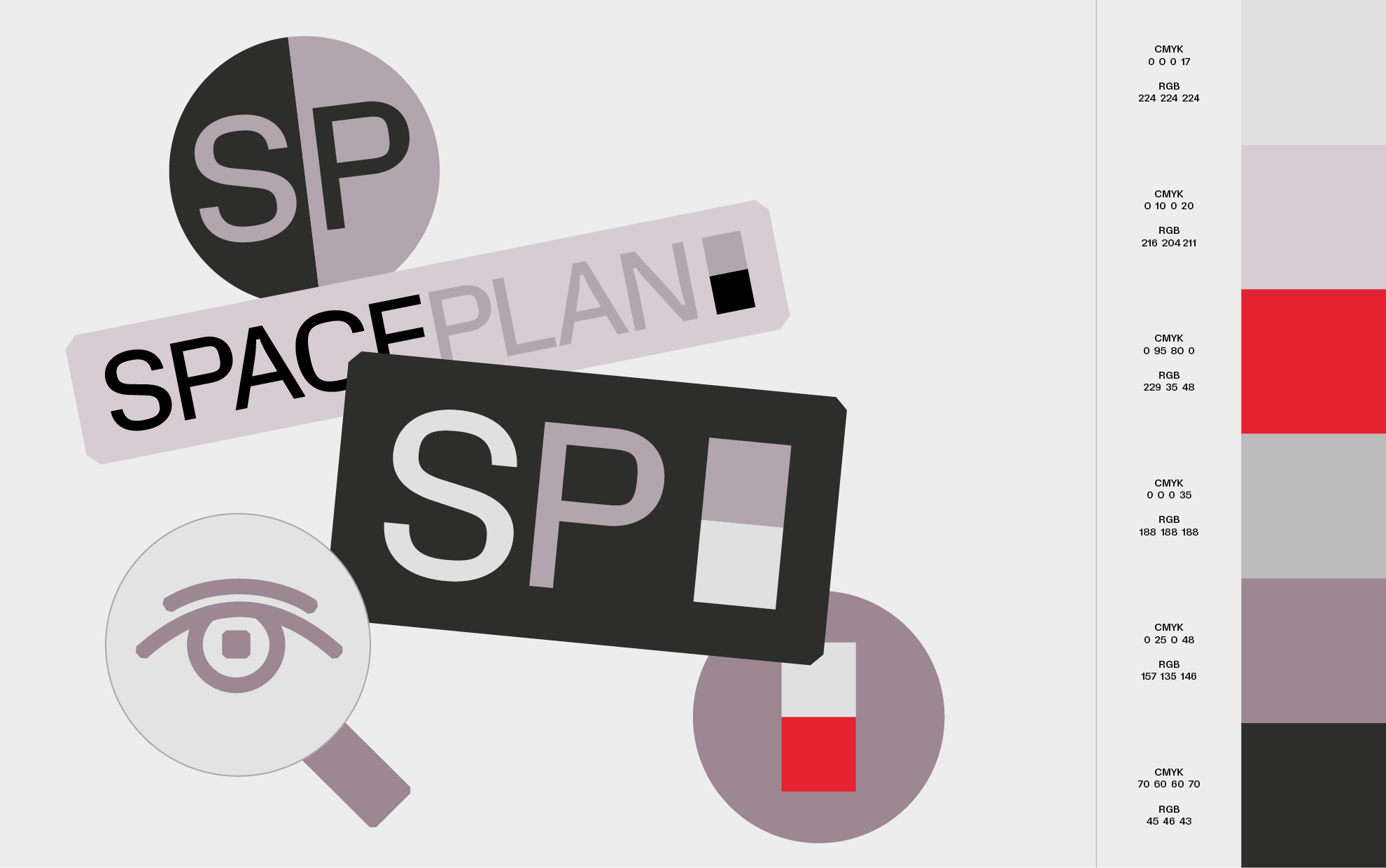Space Plan je firma, která projektuje kanceláře na míru. Když máte „Plán“, budete mít i „Space“. Původní logo bylo od Tomáše Machka, my jsme pokračovali v jednoduché typografické linii, která vizuál provází. Původní čtverce z loga se přesunuly na konec značky. Barevně jsme logo upravili do záměrně nebarevných tónů šedé, bílé a černé. Odstín šedo-fialové jsme dlouho laidili, nakonec jsme se rozhodli pro MOUNTBATTEN PINK. Původní červená barva je minimalizovaná, ale v identitě se decentně objevuje. Realizace Space planu jsou totiž hodně různorodé, jsou plné barev a tak střídmá linie barev v logu je záměr. Volbou písma KMR Apparat podtrhujeme designové zaměření firmy. Identita čeká na rozpracování webu a sociálních sítí.