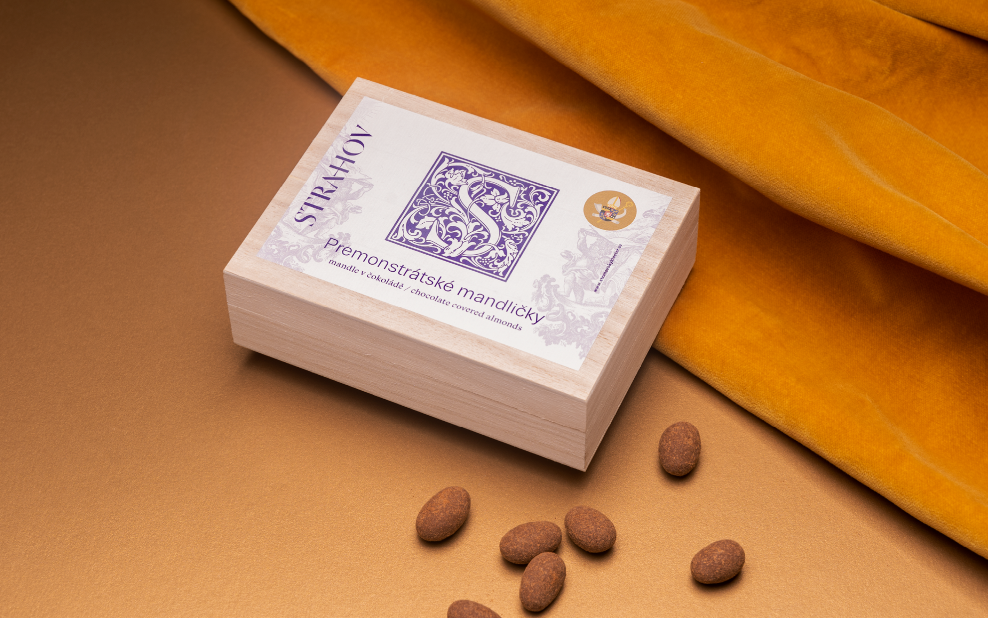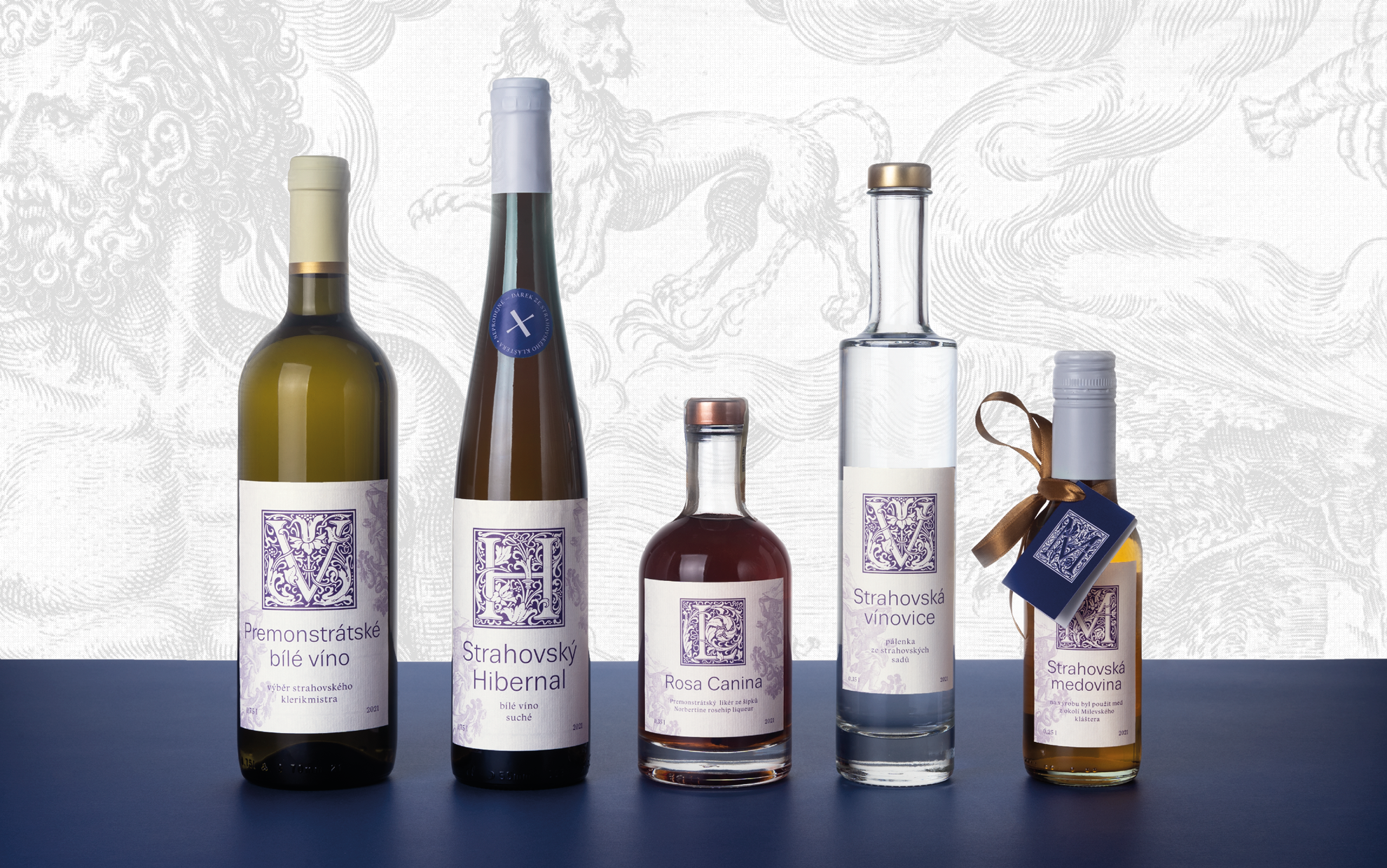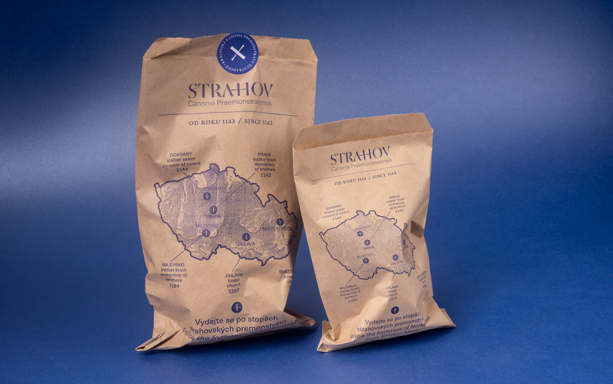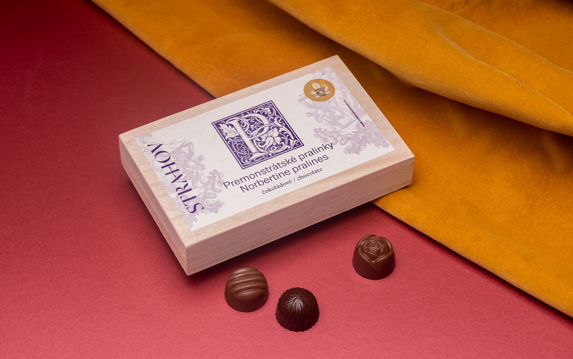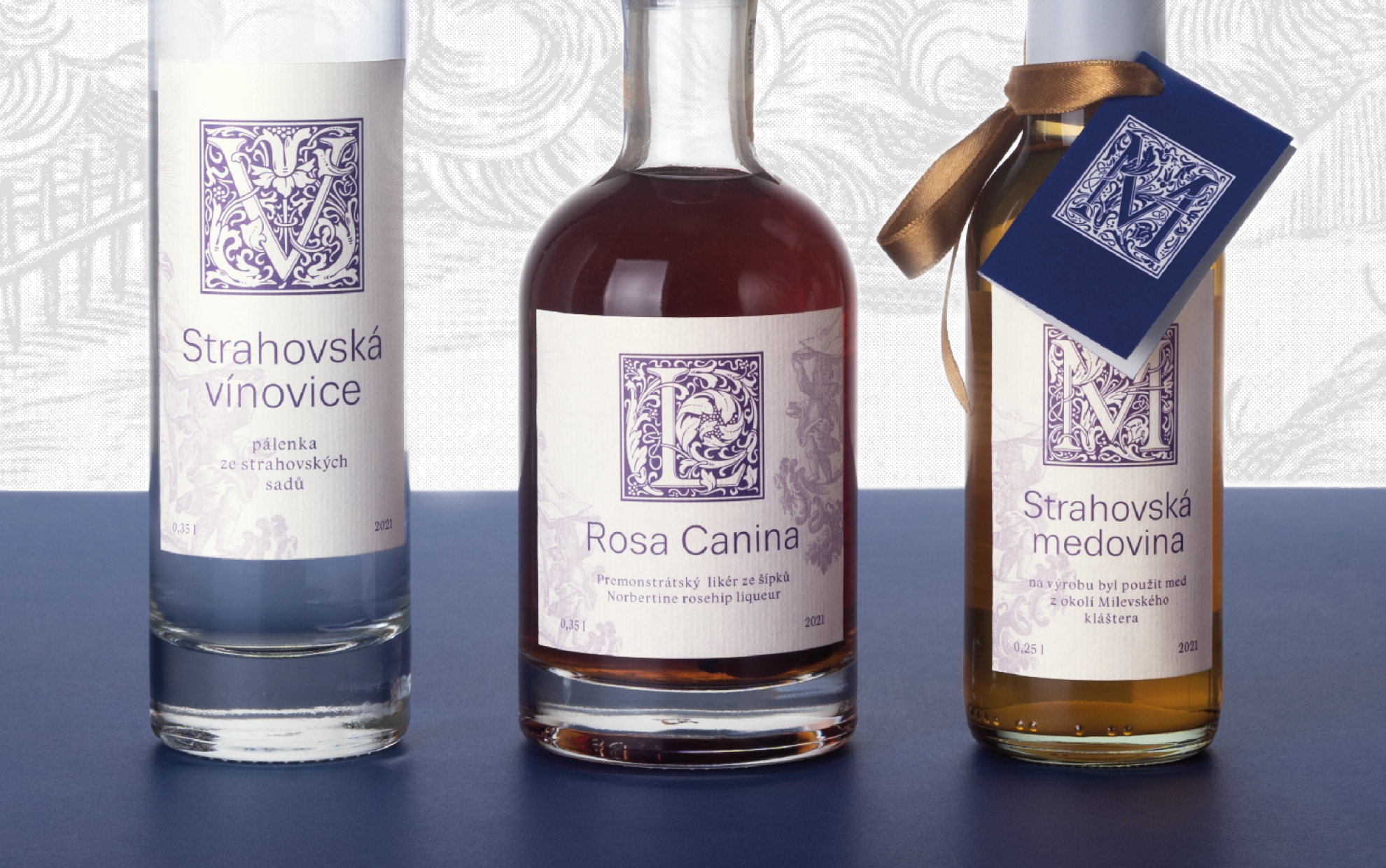 V klášterním obchodě v areálu Strahova si můžete zakoupit původní produkty, jako jsou Premonstrátské pralinky, čokoláda nebo víno. Naším cílem bylo vytvoření universálního grafického principu, který by v různých obměnách na obalech prezentoval premonstrátský řád a jeho práci. Jako hlavní motiv jsme si vybrali písmo Goudy Initials, které v sadě obsahuje iniciály ve čtvercích s rostlinným motivem. Počáteční litery spolu s modrou barevností tvoří hlavní vizuální prvek etiket. V kombinaci s jednoduchou Trivií v řezu Book, vzniká nadčasový design, který se hodí k nekomerčnímu a osvícenému zadavateli.