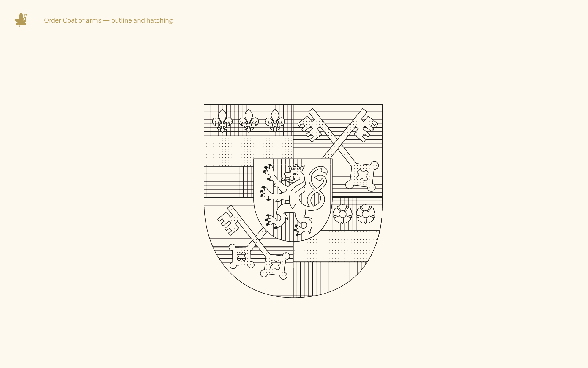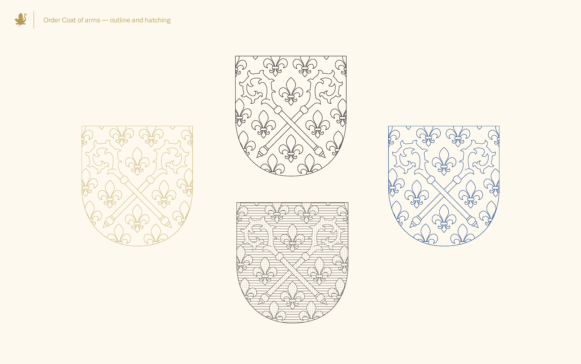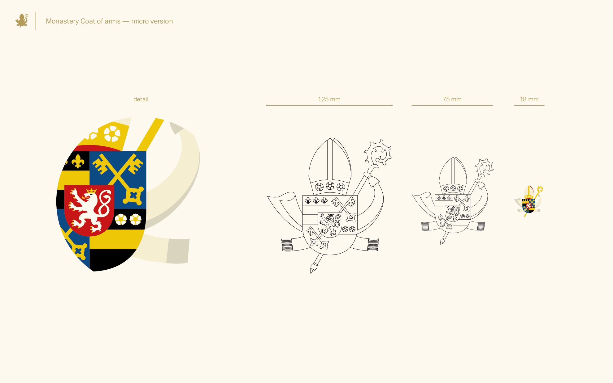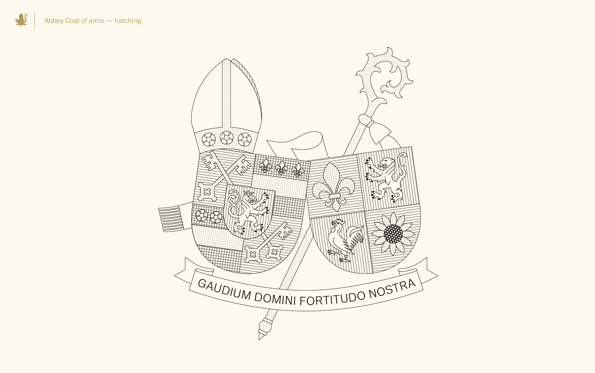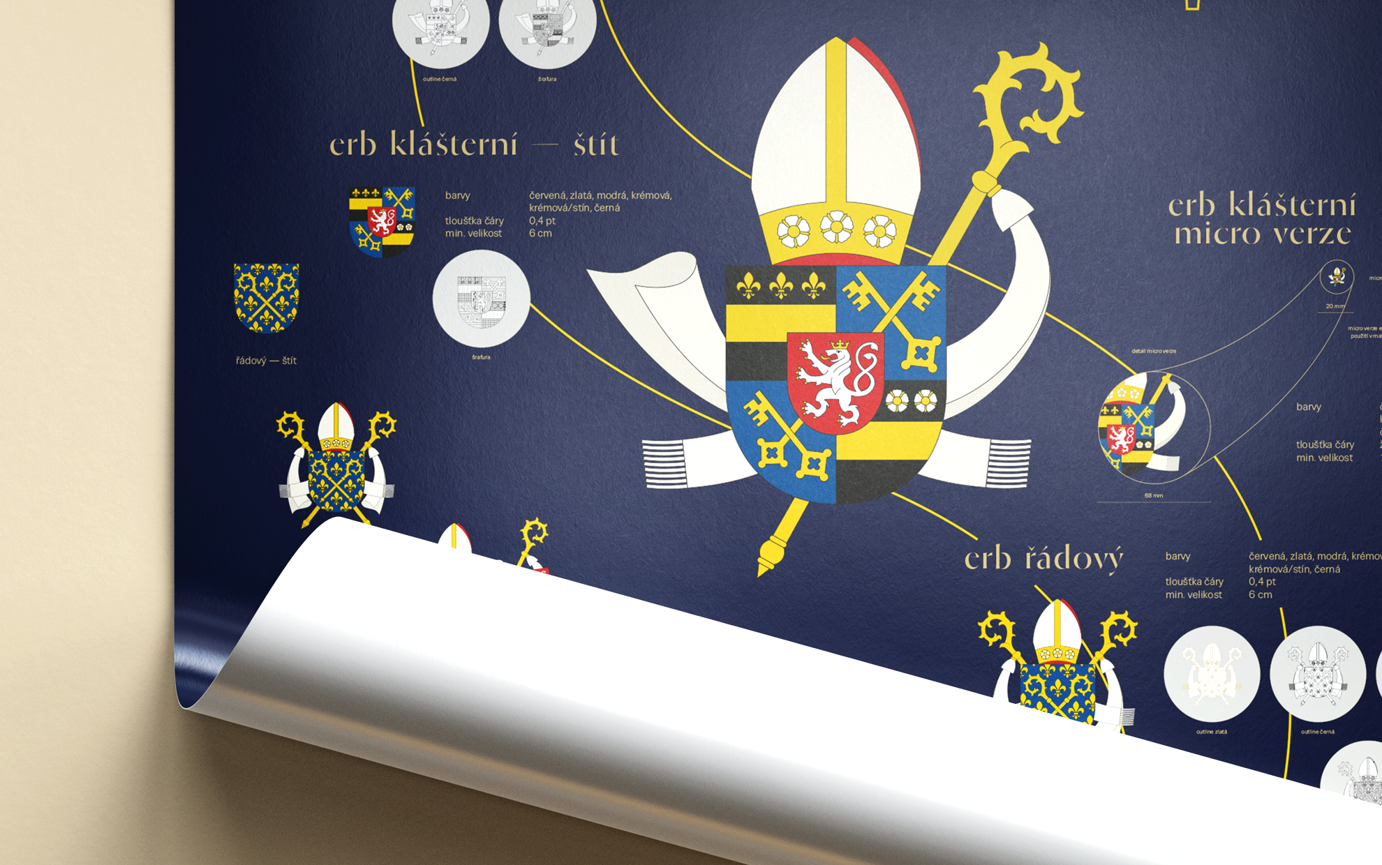 Překreslených erbů je několik, jako hlavní je erb klášterní, který má za hlavní atributy štít, mitru a berli. Následuje erb řádový, který ve štítu nese symbol lilie v rozmnoženém paternu spolu s berlemi. Štíty z obou erbů mohou fungovat i samostatně, jde o verze jednoduché. Nakonec jsme řešili erb opatský, který je složen ze dvou pavéz, přičemž pravý štít nese atributy vlastní současnému opatu Danielovi — lva bez koruny, lili, kohouta a slunečnici. Všechny erby fungují v jemné, outline verzi, ale i v heraldické „barevné“ verzi, sestávající se z šrafur, významově nesoucí příslušnou barevnost.