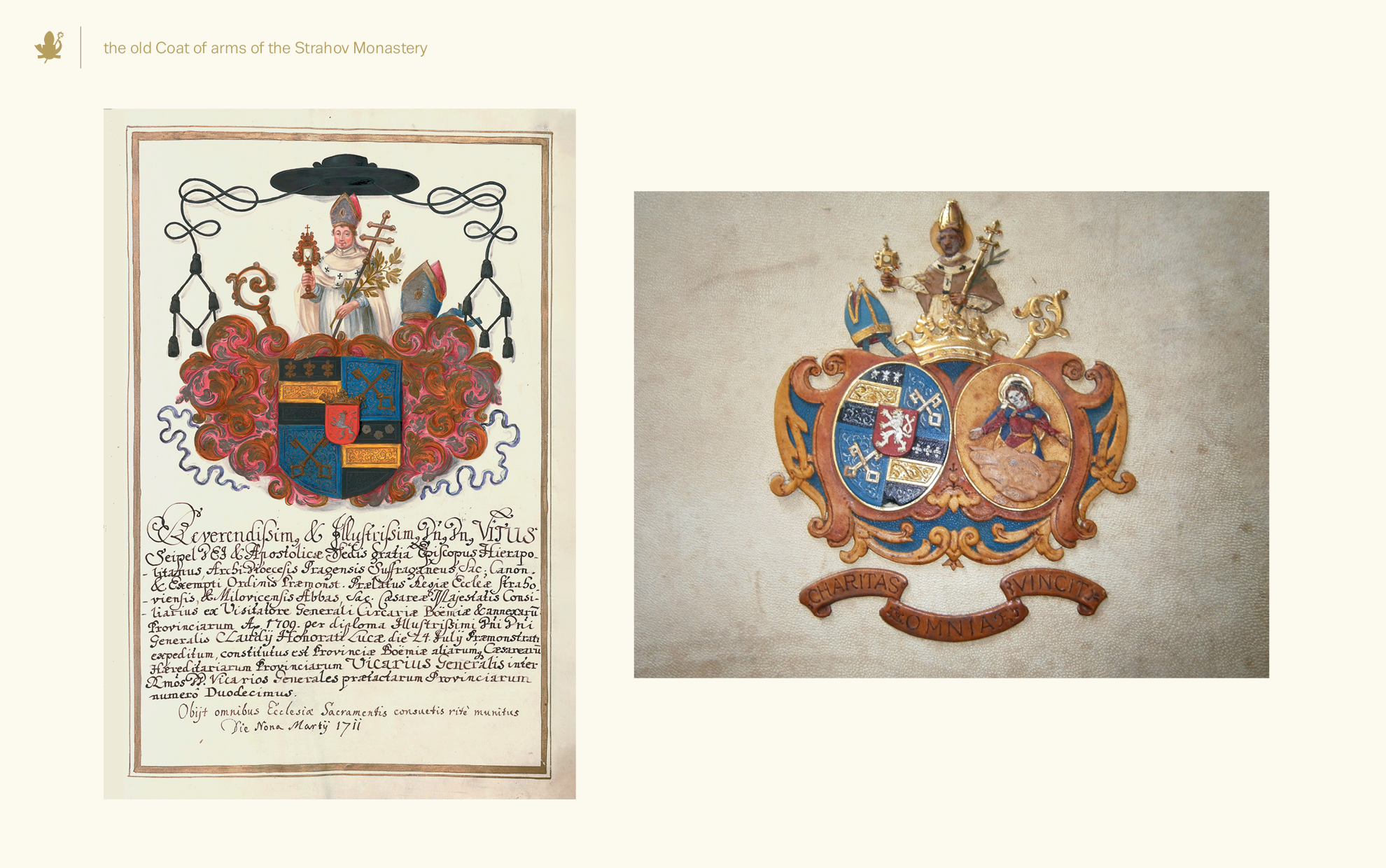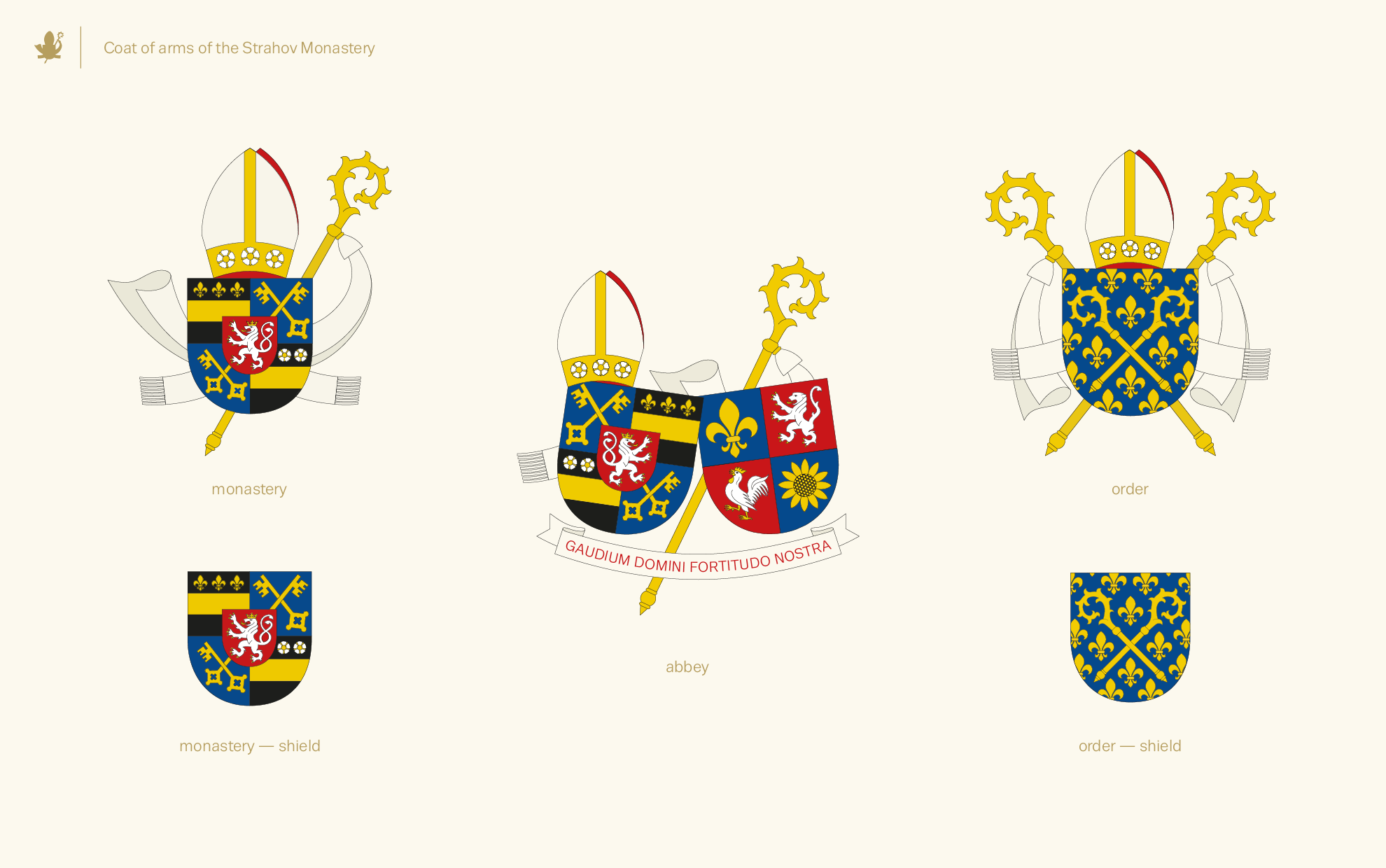 Práci pro premonstrátský klášter na Strahově jsme začali v červnu 2021. Jedná se o realizace různých druhů tiskovin, knih ale i návrhu erbů, nebo venkovního infosystému areálu. Naše práce navazuje na logo Strahova, které pro premonstráty vytvořil František Štorm. V celém systému používáme jím navržená písma Trivia Sans a Trivia Humanist, někdy doplněná titulkovým písmem St. Croce. Dominantní barvou je královská modrá, která vychází z premonstrátského erbu.